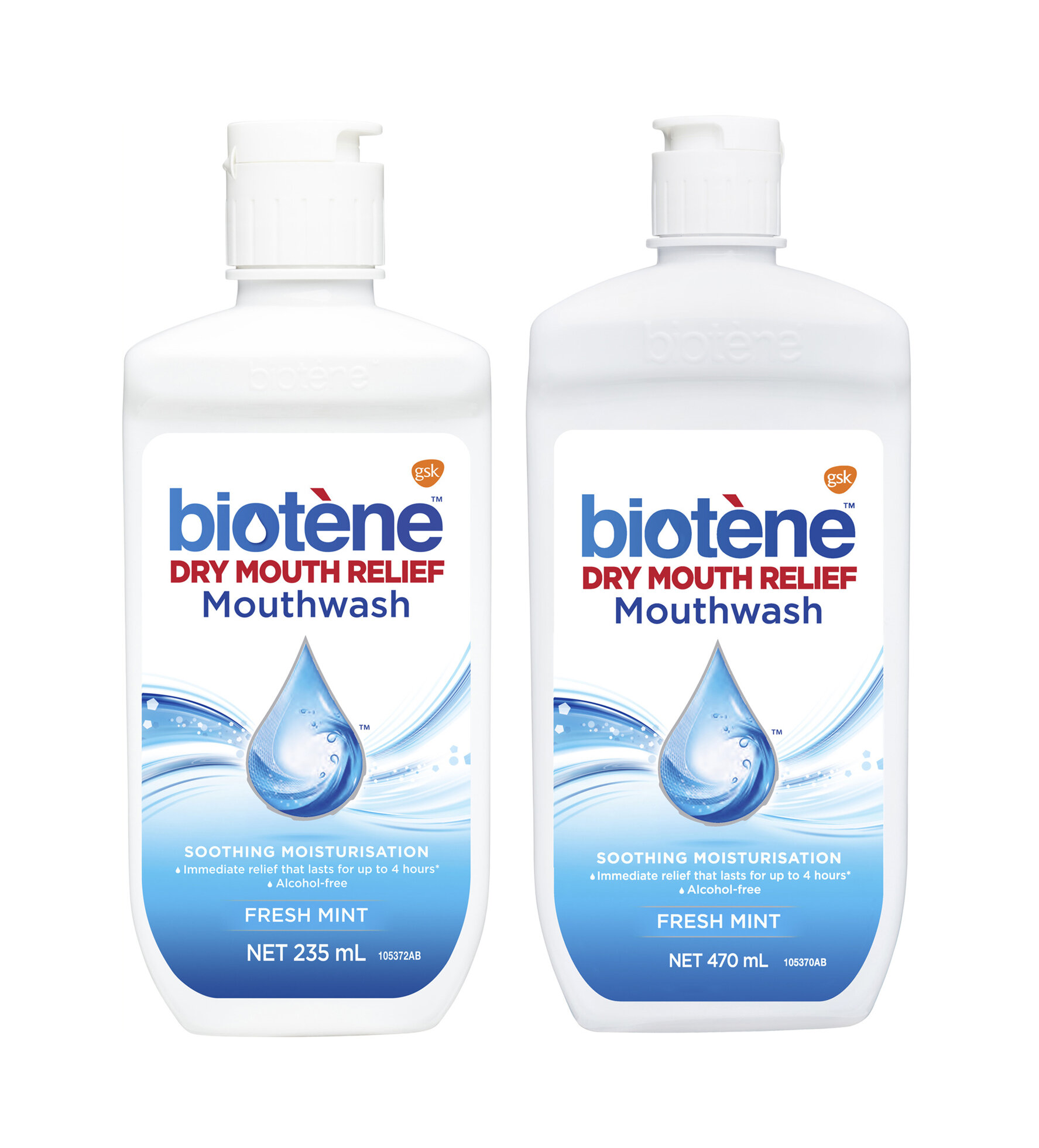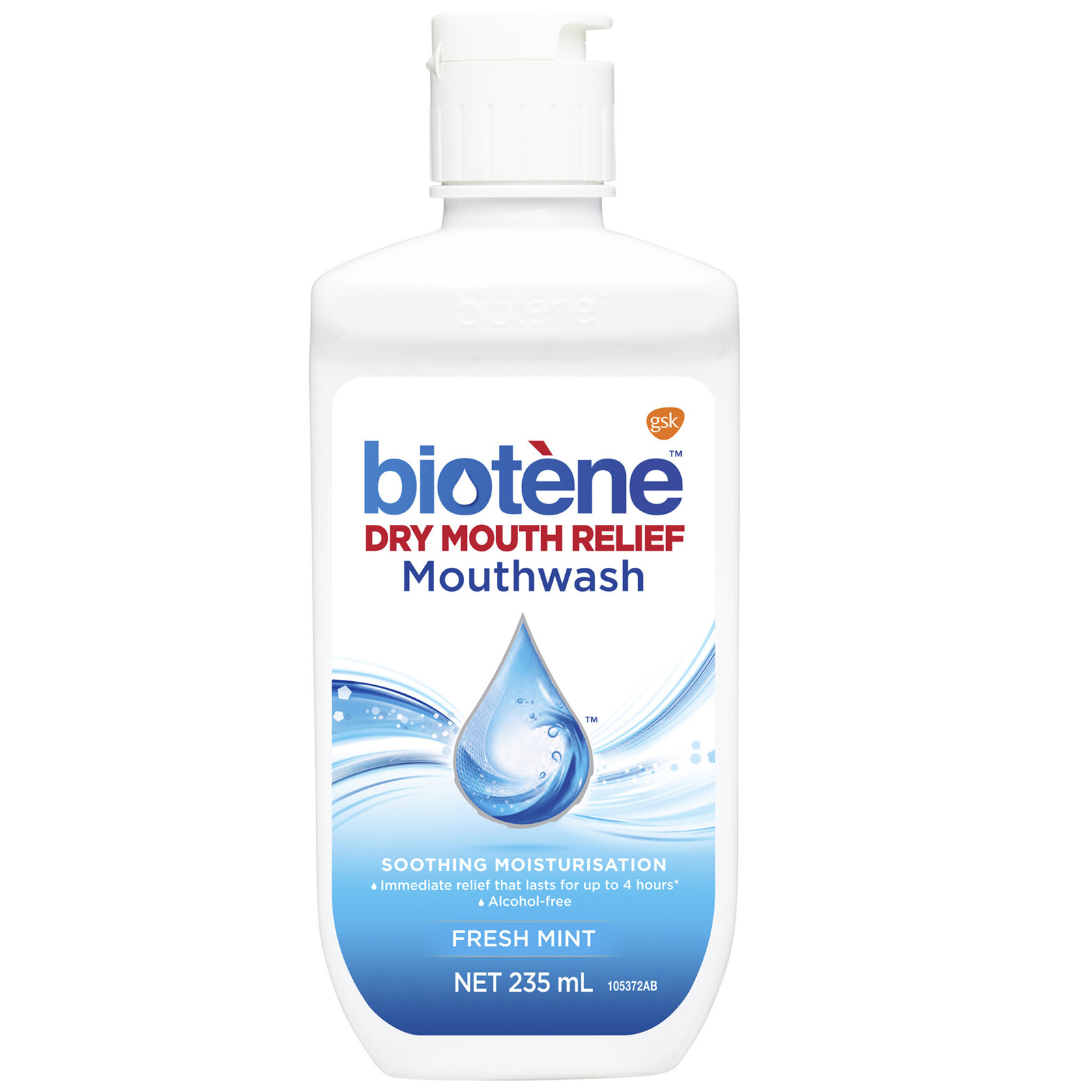 Biotene Dry Mouth Relief Mouthwash is an oral rinse with a soothing, gentle feel that helps clean, refresh, relieves the feeling of a dry mouth and soothes oral tissues. Biotene contains moisturisers to help relieve mouth dryness. Biotene Dry Mouth Relief Mouthwash is specially formulated to provide immediate relief from the feeling of a dry mouth that lasts for up to 4 hours* while it freshens your breath.