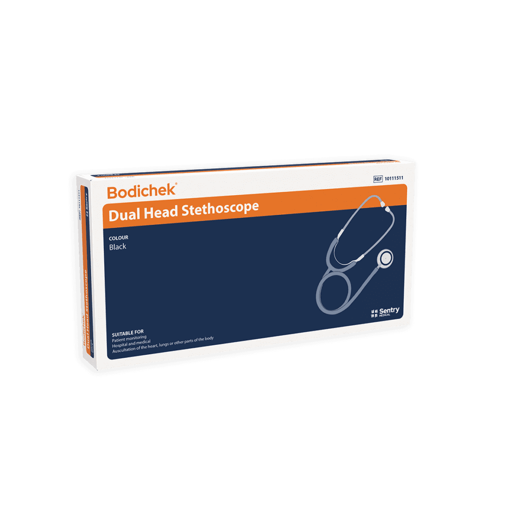 The Bodichek Dual Head Stethoscope features a double function chest piece, PVC tube, binaural sound, and ear tips. It is designed for precise auscultation, allowing healthcare professionals to assess various sounds of the heart, lungs and other organs.