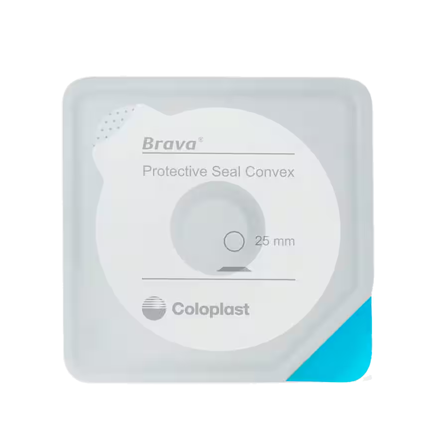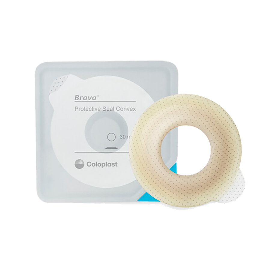 The Brava® Protective Seal Convex is designed with dual adhesive technology, with skin friendly adhesive facing the skin and erosion resistant adhesive towards the stoma. It provides a protective seal around your stoma and is designed to protect the skin against leakage and provide convexity to the peristomal area for stomas at or below skin level.