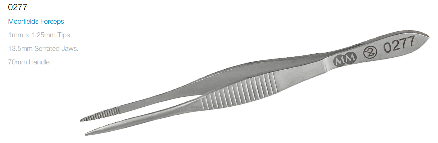 The Moorfield Forceps are a multipurpose surgical tool that ophthalmic surgeons commonly use to grasp, mobilize and manipulate the conjunctiva and other soft tissues of the eye.