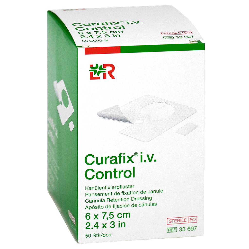 Curafix i.v. Control consists of a nonwoven/film laminate. The transparent viewing window makes it possible to observe and monitor the puncture site without having to change the dressing. In particular cannulas with injection ports can be safely affixed thanks to the die-cut opening and overlapping dressing wings.