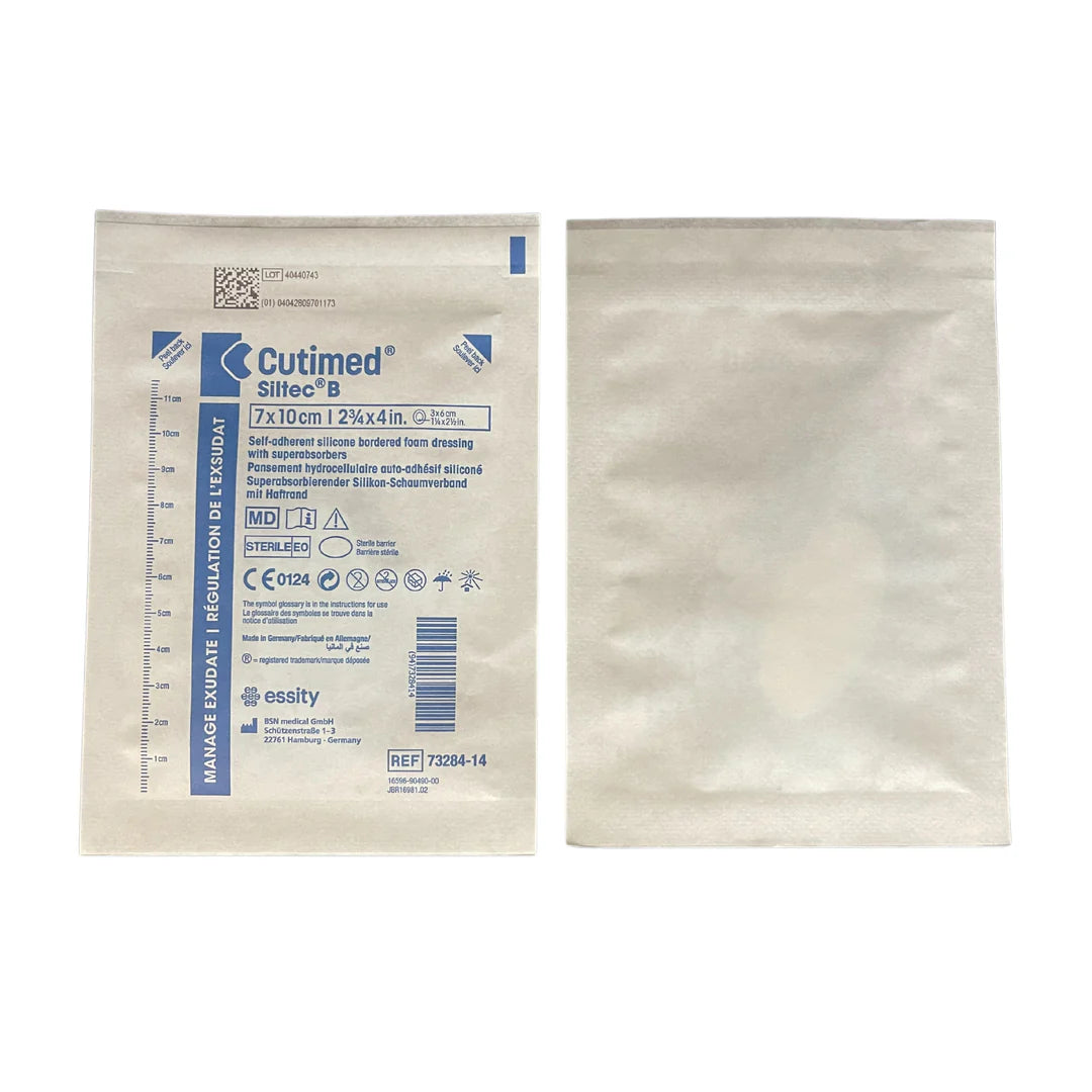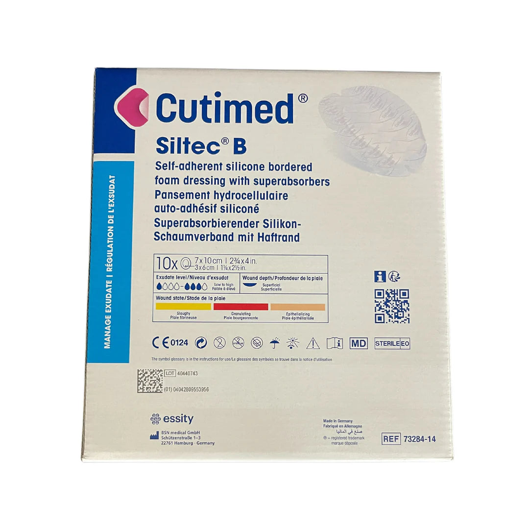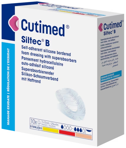 Indications: The Cutimed Siltec B assortment is indicated for exuding wounds such as: venous and arterial ulcers, pressure ulcers, diabetic foot ulcers, surgical incisions, skin grafts and donor sites, lacerations or abrasions. Cutimed Siltec B is recommended for wounds with low to high exudate levels.
