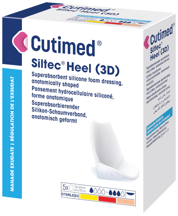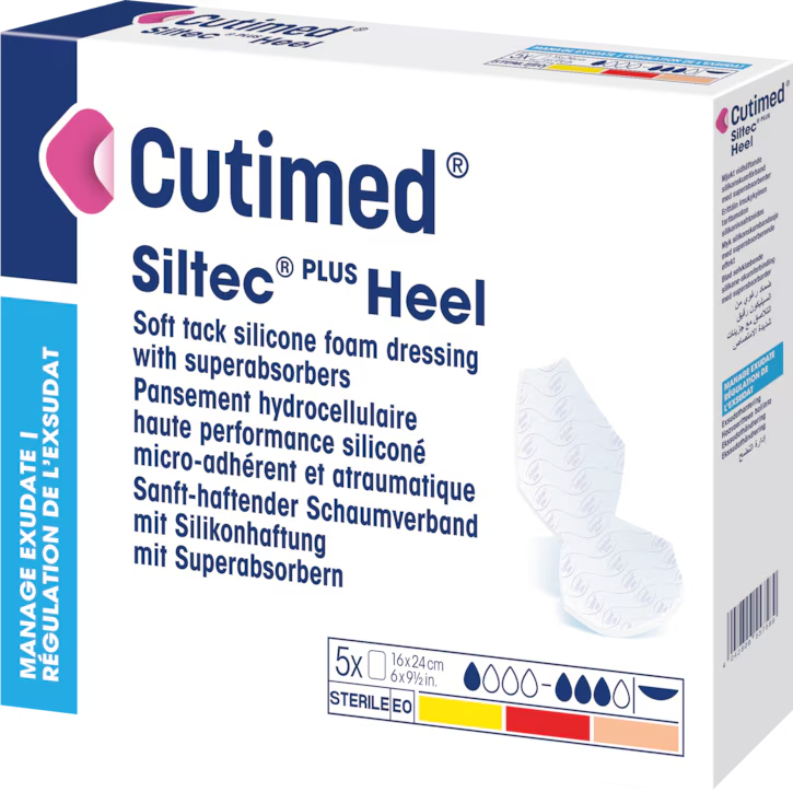 Indications: The Cutimed Siltec PLUS Heel 2D assortment is indicated for exuding wounds such as: venous and arterial ulcers, pressure ulcers, diabetic foot ulcers surgical incisions, skin grafts and donor sites, lacerations or abrasions. It is recommended for wounds with low to high exudate levels.