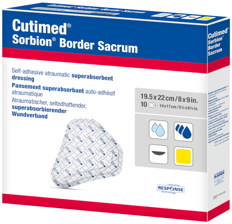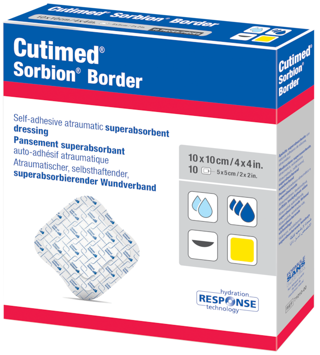 Cutimed® Sorbion® Border is a sterile, self-adhesive, superabsorbent wound dressing designed for the effective management of moderate to high-exuding wounds. Its hydroactive, gel-forming core ensures exceptional absorption and retention of wound exudate, even under compression therapy, promoting a moist wound environment conducive to healing.