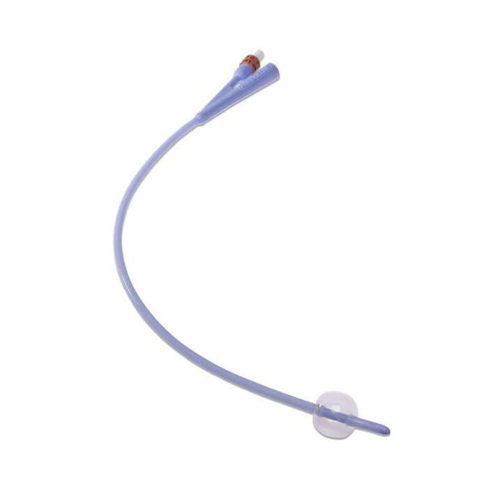 The Dover™ 100% Silicone Foley Catheter is a sterile, single-use urinary catheter designed for reliable bladder drainage. It features a 100 % medical-grade silicone construction, which is biocompatible, latex-free, and less likely to cause irritation, encrustation, or strictures compared to traditional latex catheters. The catheter has a 2-way design with a 5 mL balloon that securely holds it in place once inserted. Its smooth, reinforced tip and large drainage eyes support comfortable insertion and efficient urine flow, while the soft, flexible shaft enhances patient comfort during use. Color-coded inflation connectors are compatible with standard syringes for easy balloon inflation.