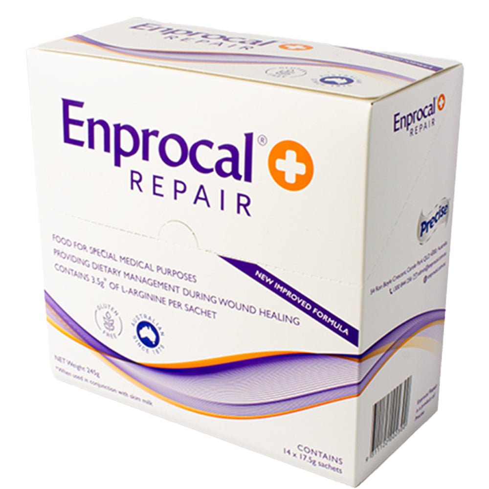 Enprocal Repair is a nutritional supplement powder fortified with L-Arginine designed to support wound recovery. Developed from the nutrient-dense food supplement Enprocal, Repair provides an additional source of energy, protein and micronutrients known to be beneficial to wound healing.