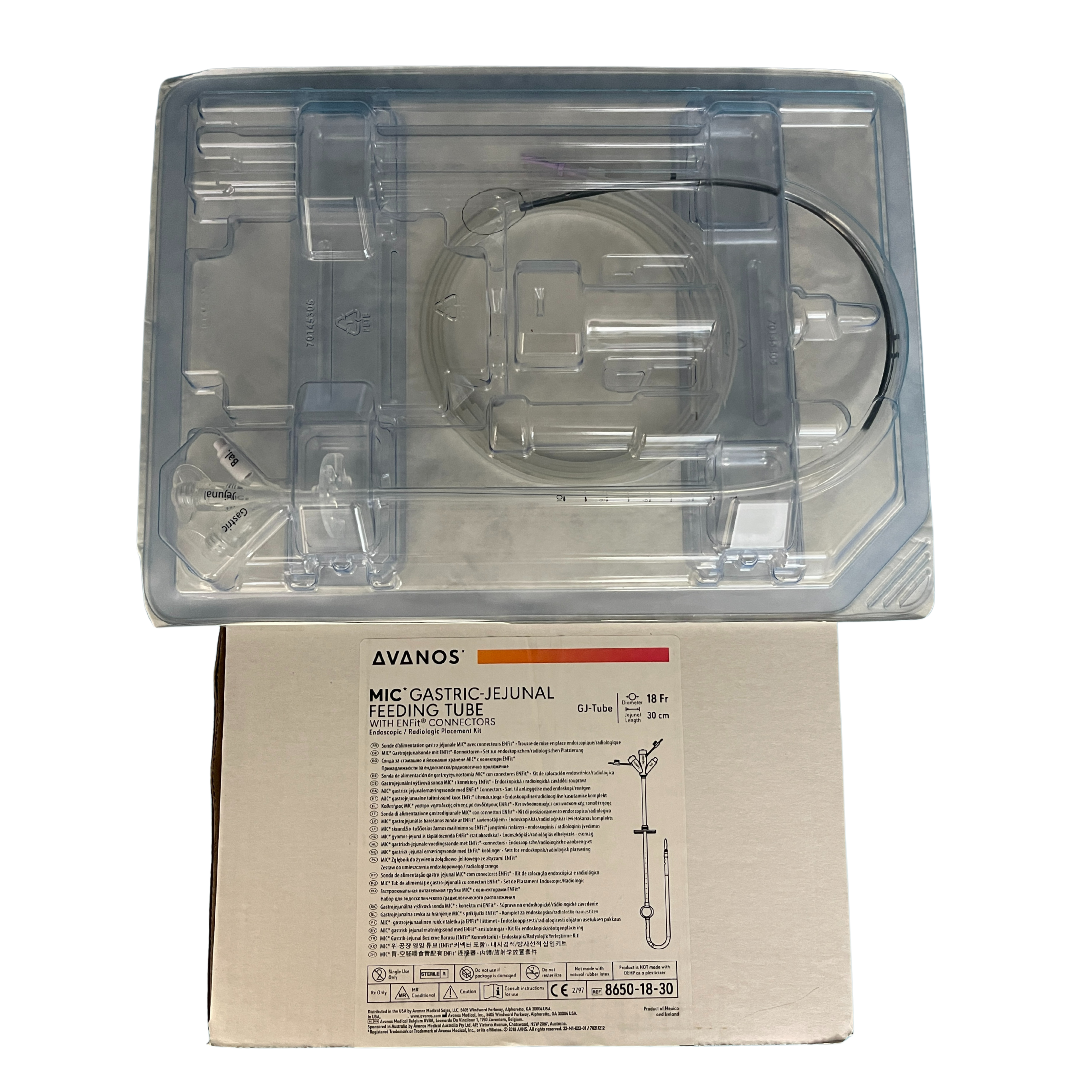 The unique Avanos Medical MIC* Transgastric-Jejunal Feeding Tube is designed for patients who require simultaneous gastric decompression and jejunal feeding. Accompanying the tube are 35ml catheter tip syringe and 6ml LUER-SLIP* syringe, as well as directions for use. Available in several sizes to meet individual patient needs.