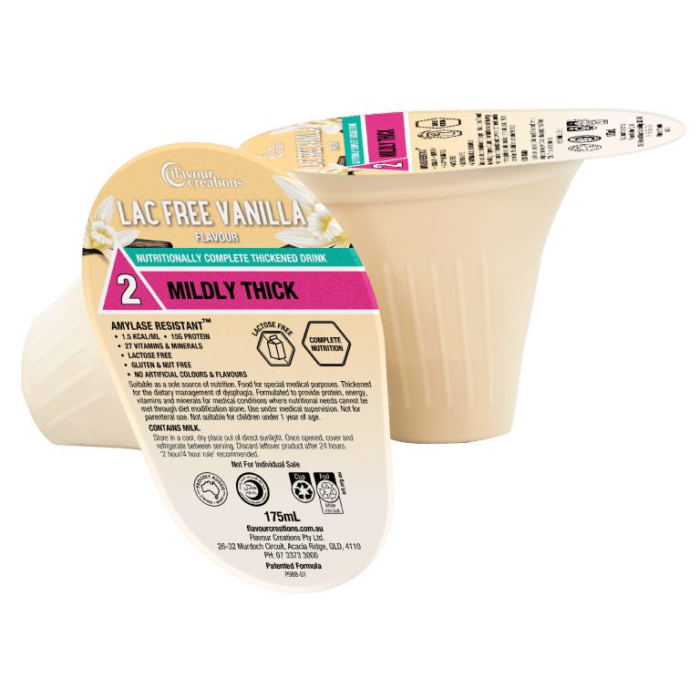 Flavour Creation Lactose Free Vanilla is a delicious ready-to-drink thickened supplement, that delivers 15 grams of protein and 27 vitamins and minerals. This complete nutrition supplement is available in IDDSI Level 2 & 3. Lactose Free Nutritionally Complete Vanilla is packed in our award-winning patented Flavour Creations Dysphagia Cup, specifically designed for those with swallowing difficulties (dysphagia).