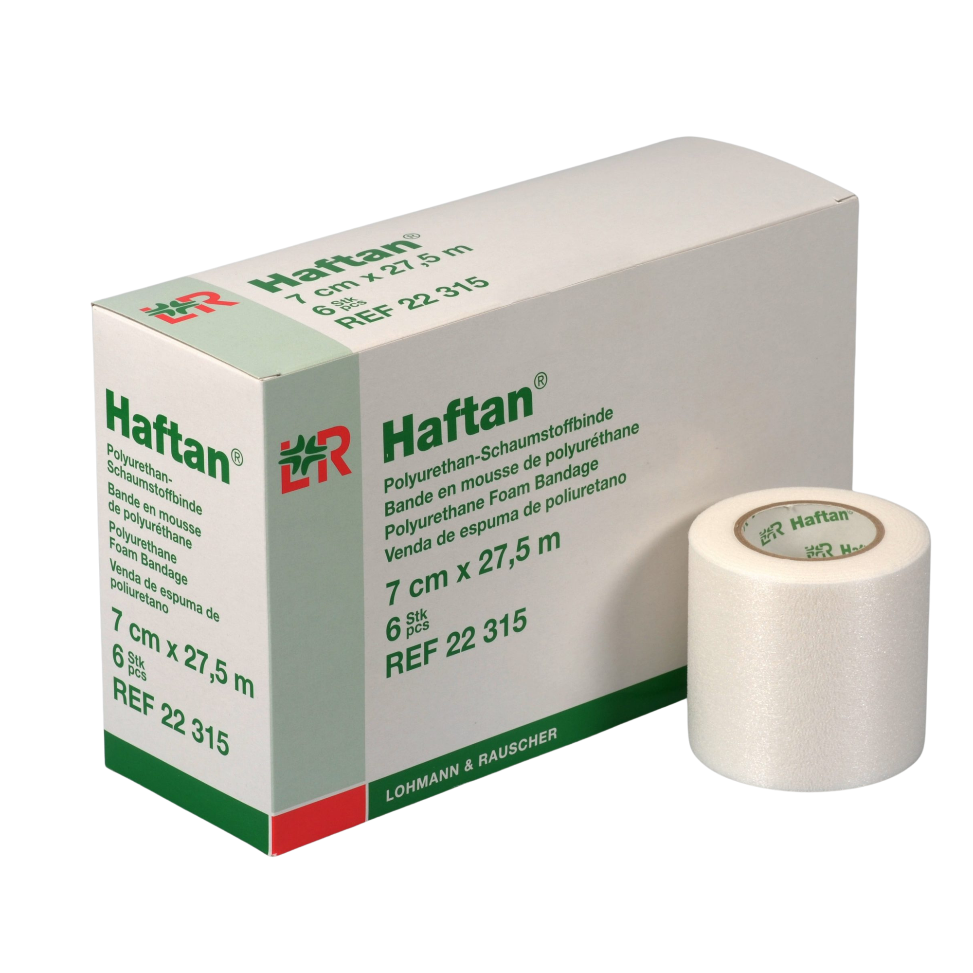 Haftan Bandage retains undercast padding material evenly and without bulging, particularly when combined with synthetic material. Haftan-s fine, open-pored surface allows consecutive wraps to adhere to one another, preventing slippage.