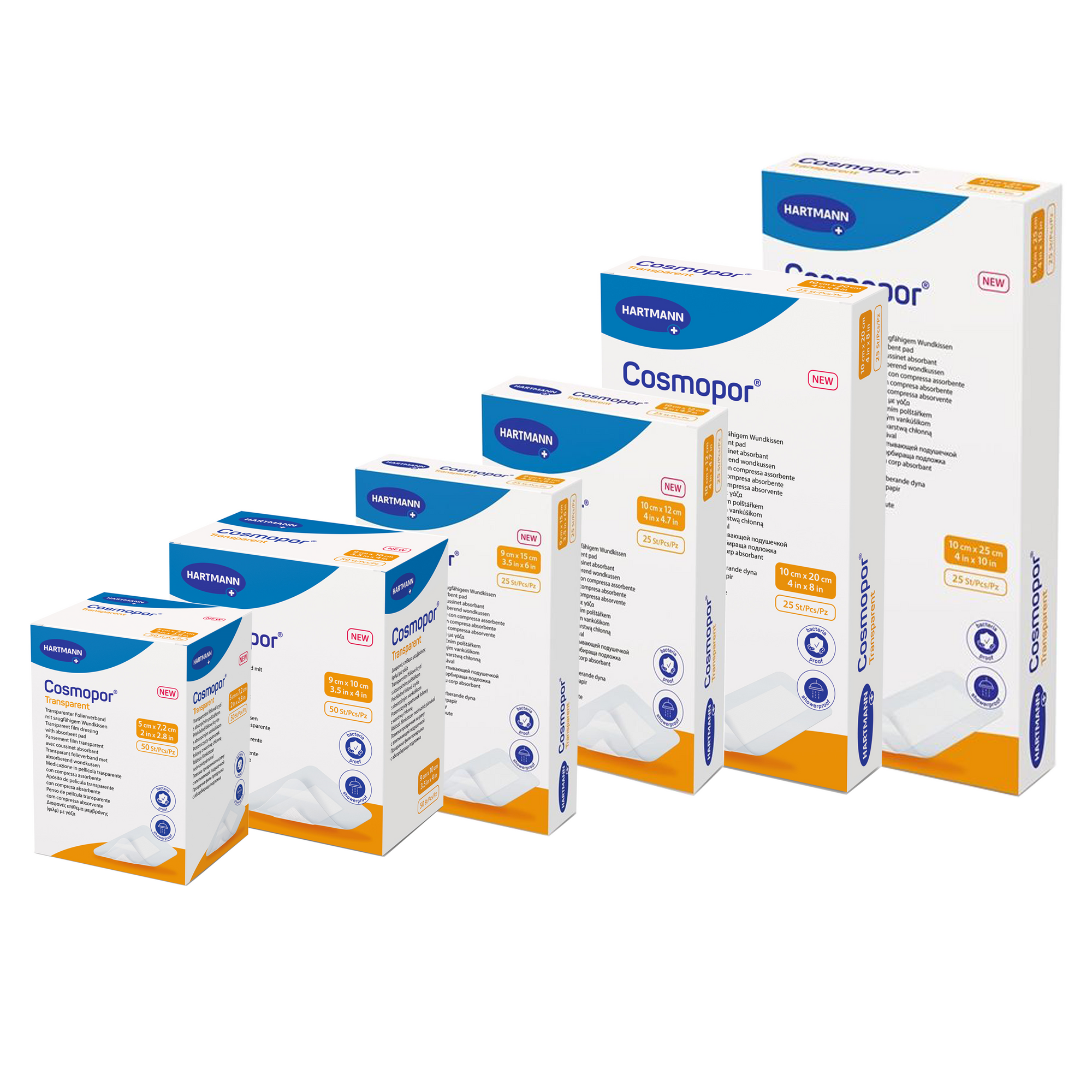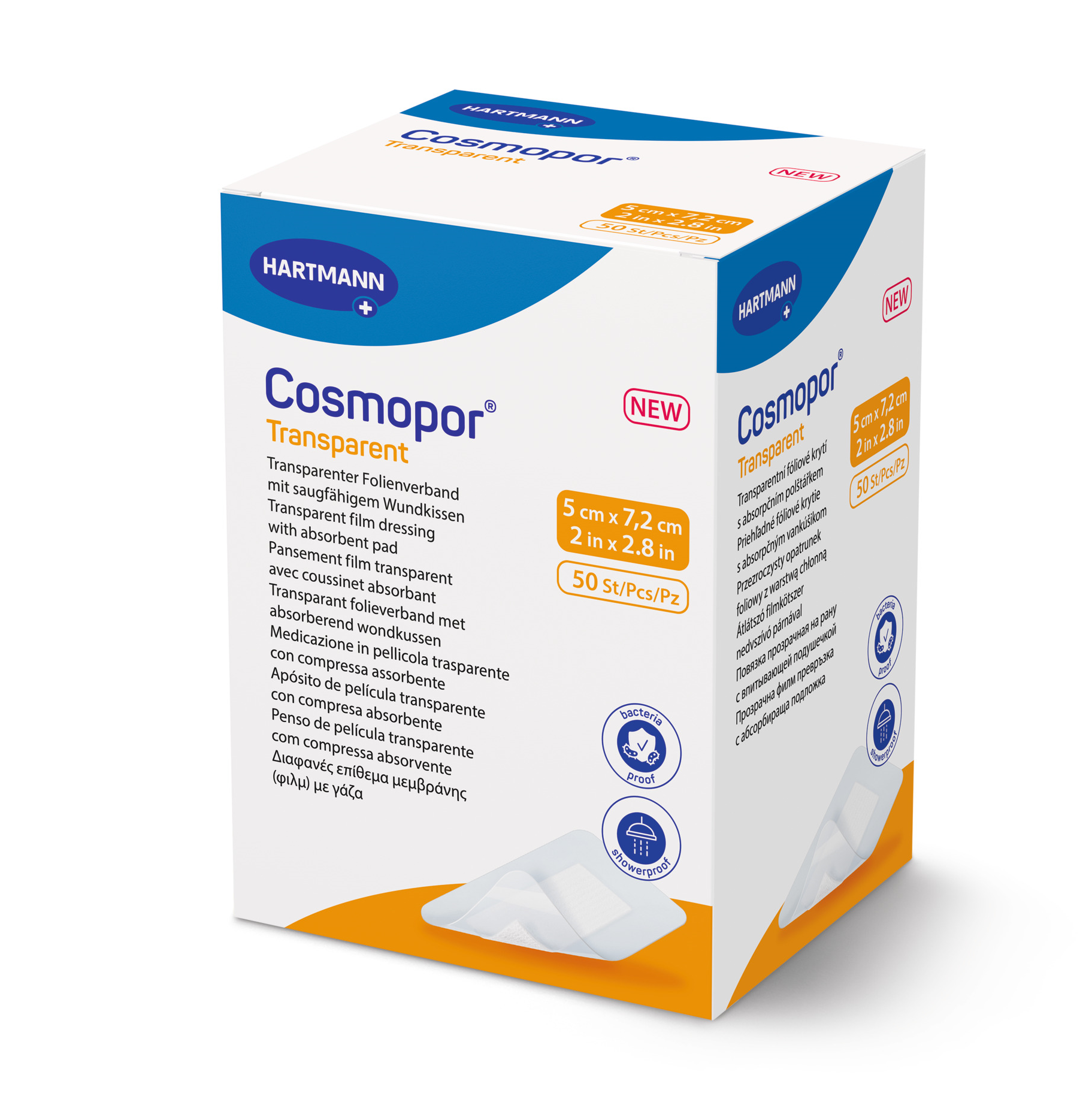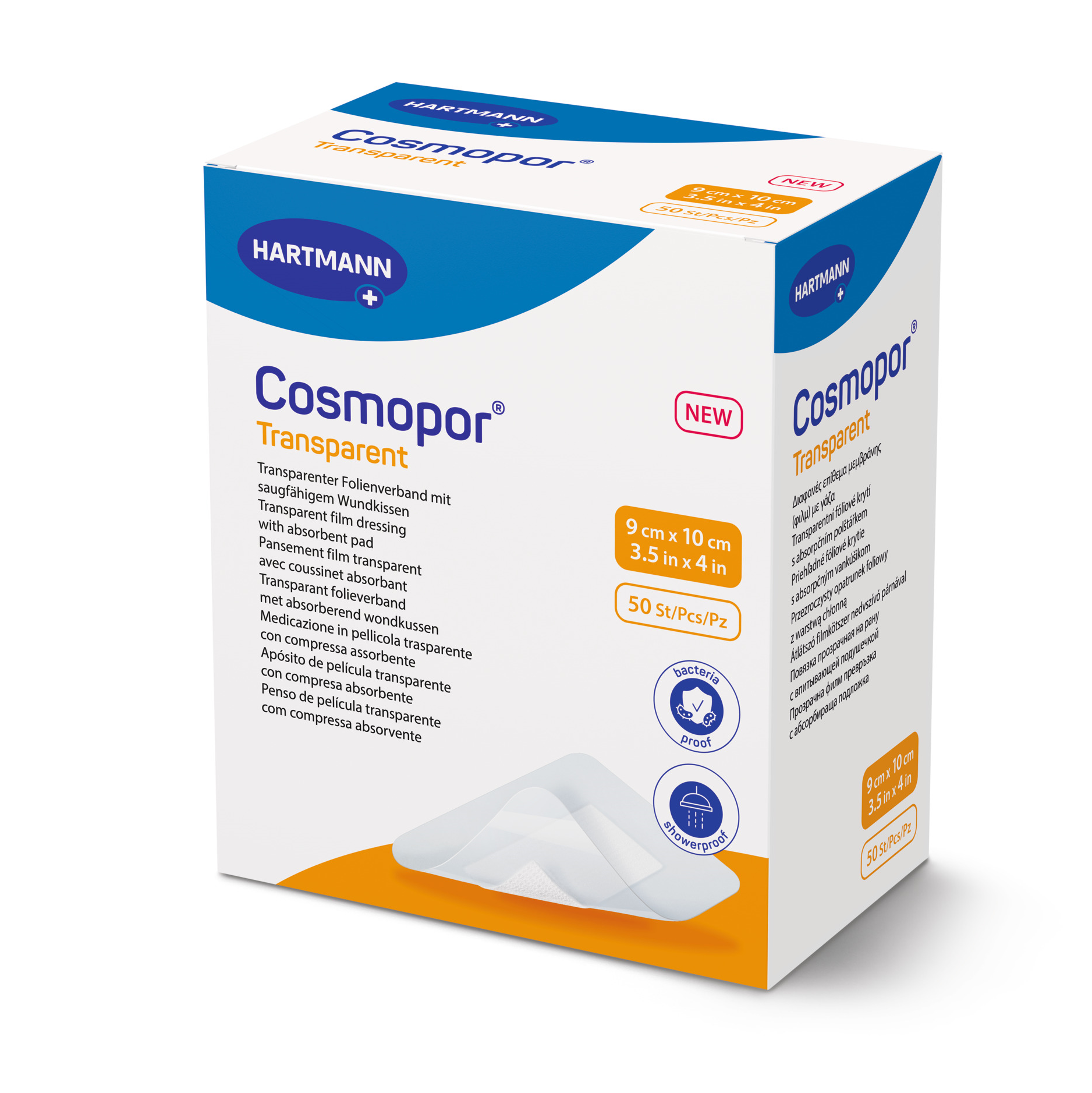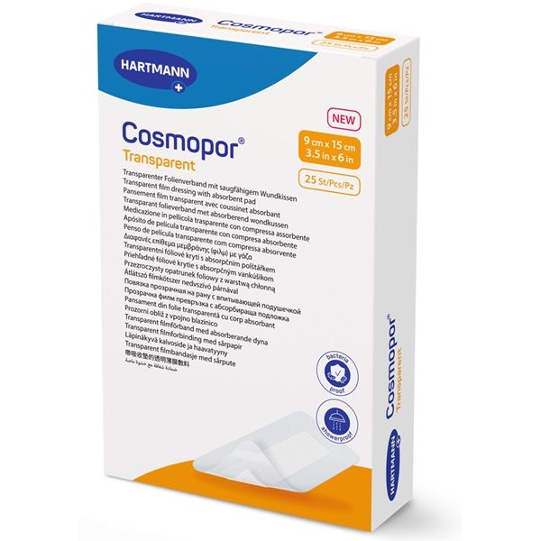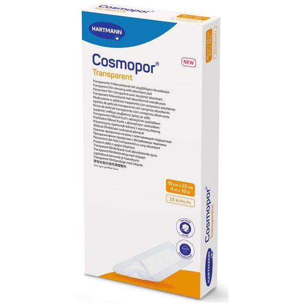 Cosmopor Transparent is a sterile, self-adhesive transparent film dressing with an absorbent wound pad, made of a semi-permeable, waterproof and transparent polyurethane film coated with a polyacrylate adhesive. The semipermeable polyurethane film is coated with a skin-friendly adhesive.