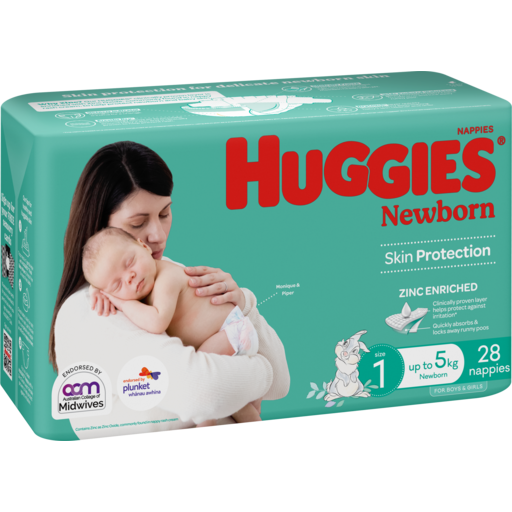 Huggies Newborn Nappies are Australia's No. 1 Newborn nappy and the preferred choice for Australian hospitals. They provide our best care for your baby's delicate newborn skin. With Huggies patented DRYTOUCH layer that quickly absorbs runny poo and is clinically proven to help prevent nappy rash. Endorsed by the Australian College of Midwives as the preferred choice for baby. Huggies 3-way skincare provides the ultimate combination of softness, dryness and breathability. Made with safe, gentle ingredients and no added nasties (no formaldehyde, elemental chlorine, natural rubber latex or any chemicals restricted by Kimberly-Clark). Features a wide ultra-soft pocketed waistband that gently molds to baby's back to help stop and lock away runny poo. With up to 12 hours leakage protection, they are perfect for use both day and night. Plus a wetness indicator that turns from yellow to blue when wet, so you know when to change. Suitable for both boys and girls.