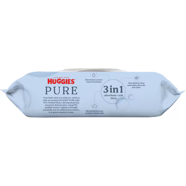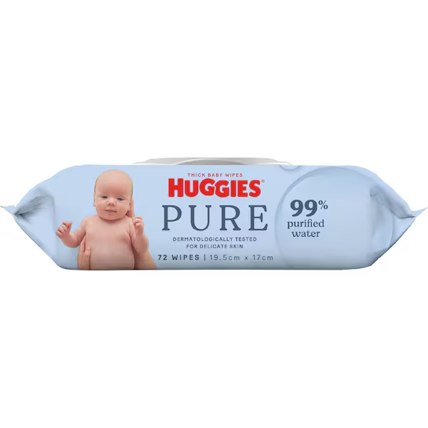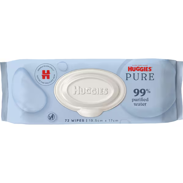 Your skin is so delicate, which is why Huggies PURE 99% Purified Water Baby Wipes is perfect for you. With 99% purified water, a splash of baby friendly essentials and no added preservatives. It is dermatologically tested for delicate skin.