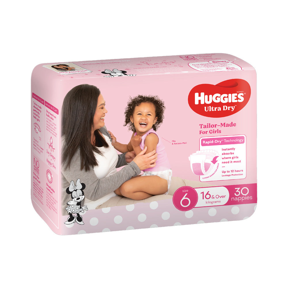 Huggies® Ultra Dry Nappies with tailor-made absorbency lower down for girls. Huggies® unique Rapid-Dry™ Technology instantly absorbs wetness and springs back dry in seconds. Keeping baby snug & dry, day & night with up to 12hrs leakage protection.