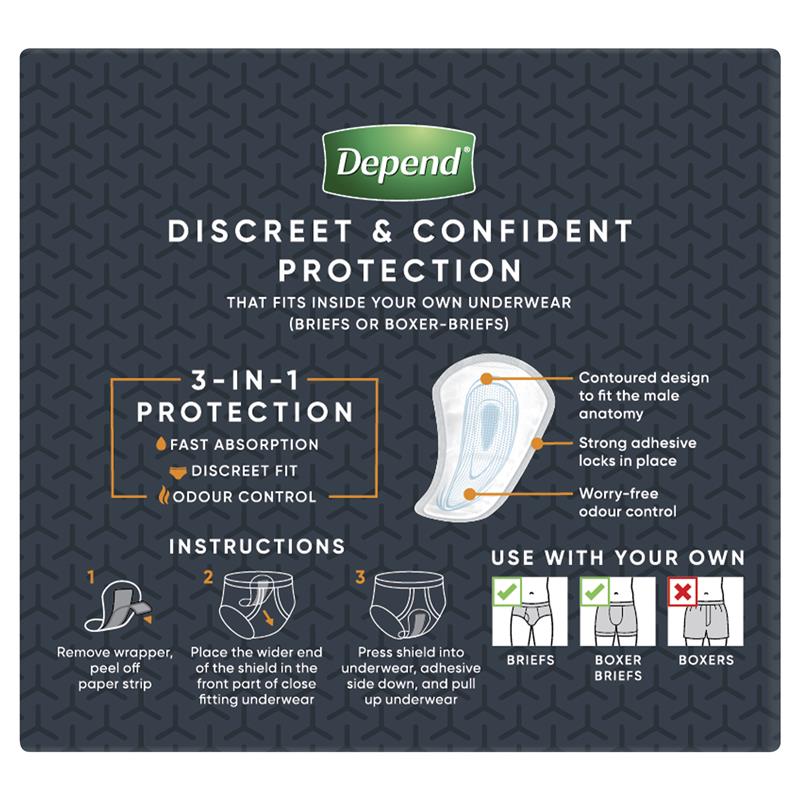 Depend Shields for Men is the lightest male product in the Depend range and offer superior absorption to give you the protection you need whilst active. Thin and discreet