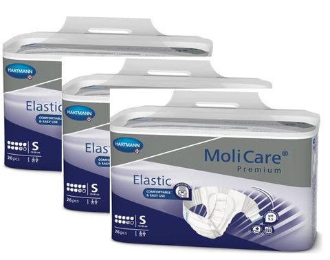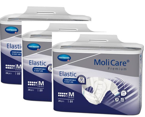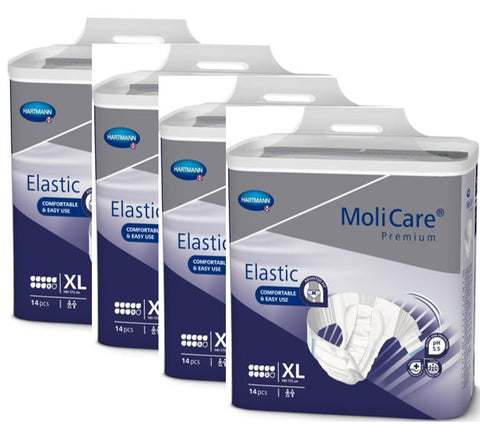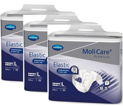 Hartmann Molicare Premium Elastic is an all-in-one incontinence slip providing secure protection while maintaining healthy skin, with an absorbency of 9 drops. The Elastic-Fix System, the unique combination of patented, elasticated side panels and re-closable tapes, allow for easy handling and secure fixation. For maximum safety and security, the MoliCare Premium Elastic offers optimum fit in every position and excellent absorbency capabilities. Molicare Premium Elastic is suitable for medium to severe levels of urinary and fecal incontinence and acts as a safe and secure nighttime solution for both active persons or bed bound patients.