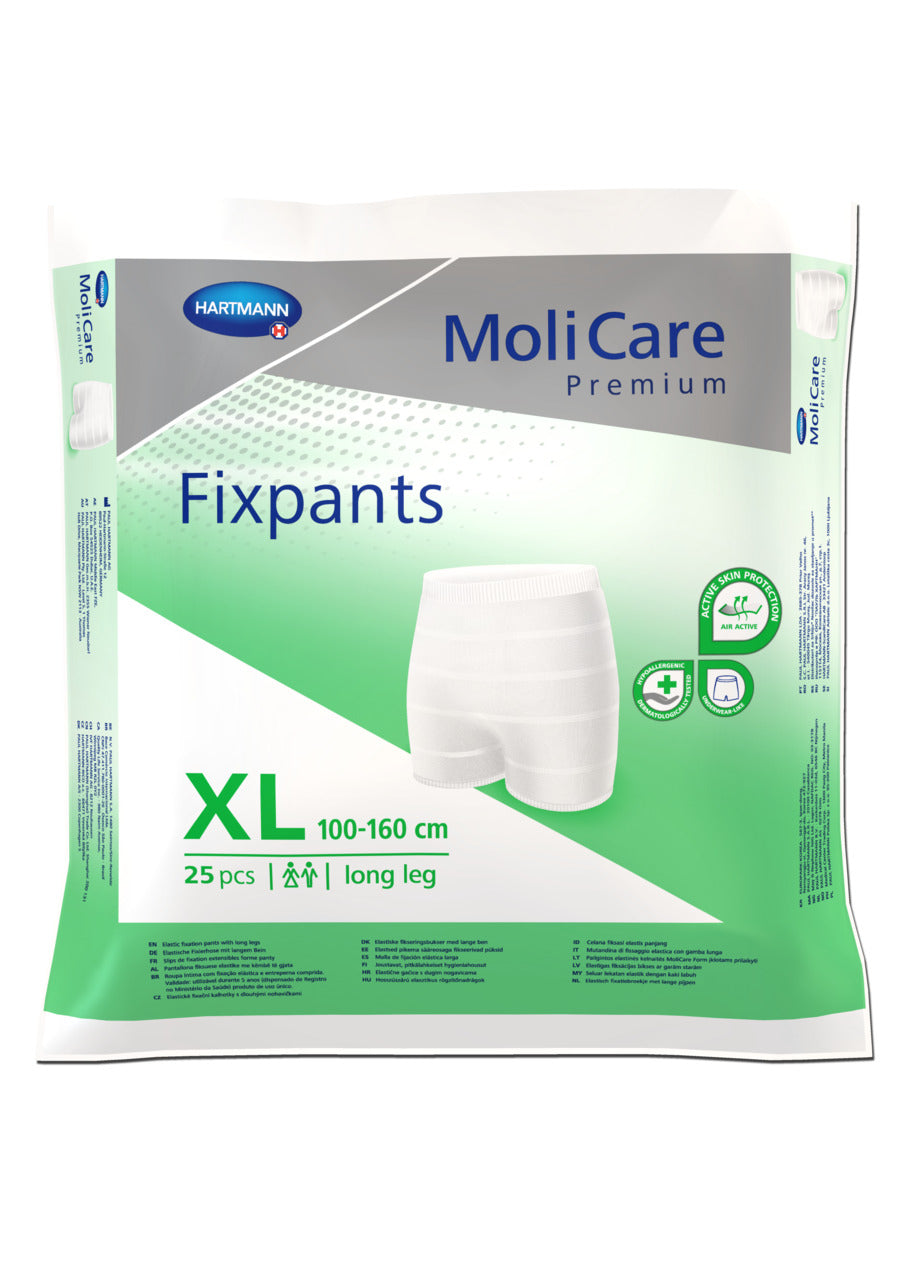 Hartmann Molicare Premium Fixpants are unisex fixation pants to ensure a safe and hygienic fixation of all types of incontinence pads. They guarantee a secure fixation for residents/patients wearing the two-piece system. The dense structure of the material makes MoliCare Premium Fixpants particularly resistant to ladders with the wetness indicator still being visible. MoliCare Premium Fixpants Long Leg is Reusable, washable at 60º C and can be tumbled at low heat. It can be washed up to 50 times without losing elasticity or softness.
