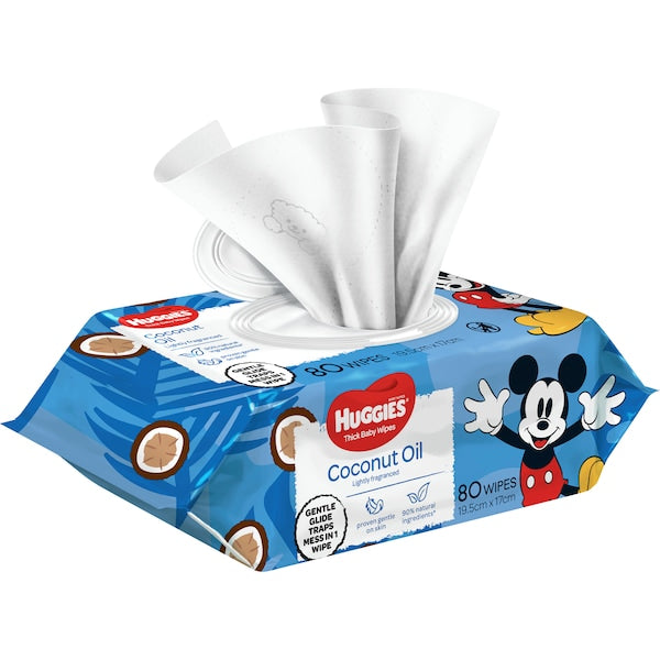 Trust us baby, things will get messy. Huggies Thick Baby Wipes Coconut Oil gently traps mess with 1 wipe. Designed with 90% natural ingredients^ and the ultimate combination of thickness, softness and absorbency for a 3 in 1 complete clean that ensures nothing is left behind on your delicate skin.
