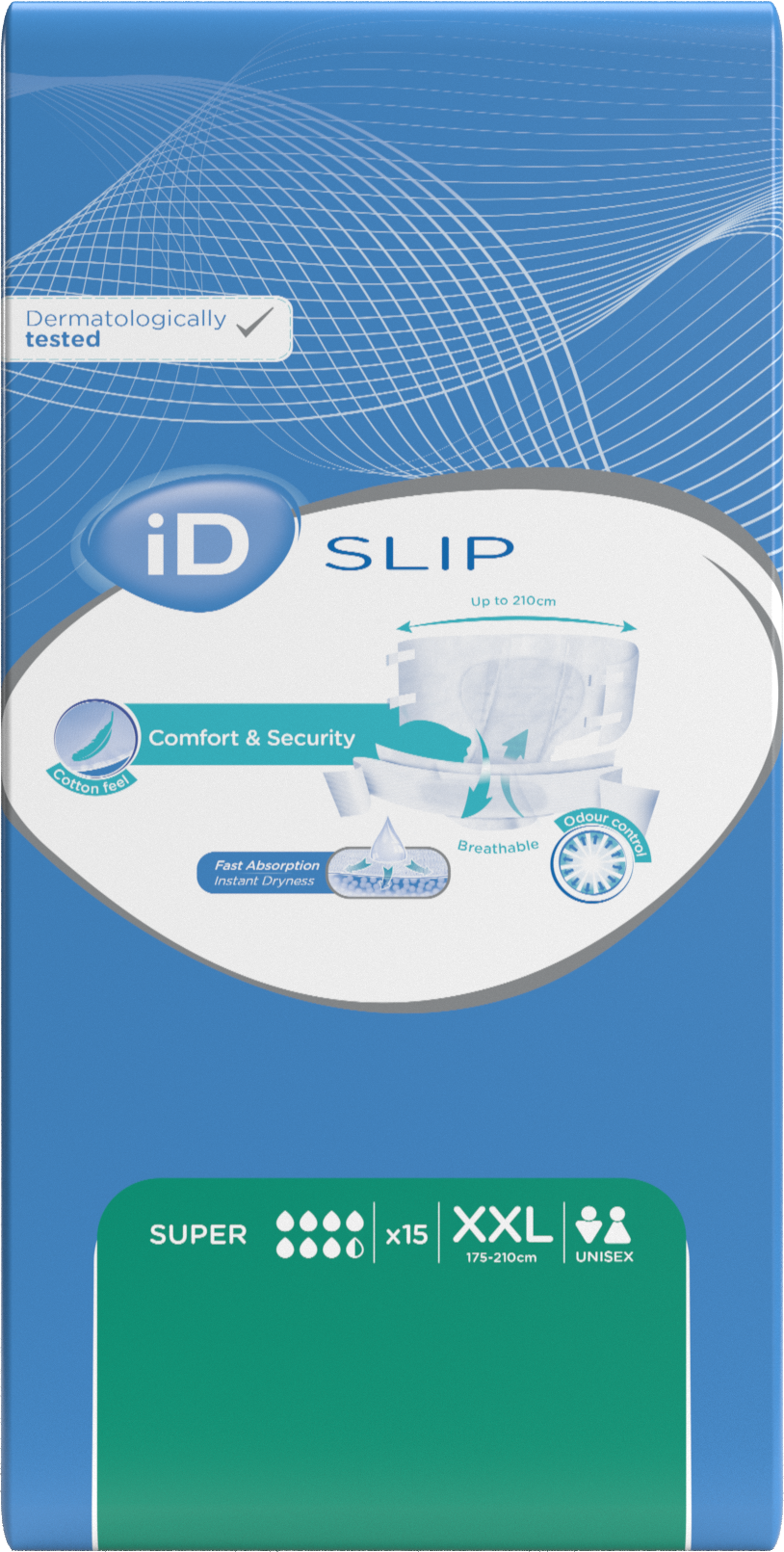 iD Slip Super is an all-in-one incontinence brief designed to deliver maximum performance and complete skin protection. With fast absorption and instant dryness, it keeps users dry and comfortable, while the 100% breathable material allows skin to breathe. The improved topsheet contains natural ingredients for added skin comfort, and the entire range features effective odour control technology and wetness indicators to signal when a change is required. All iD Slip products are dermatologically tested and approved.