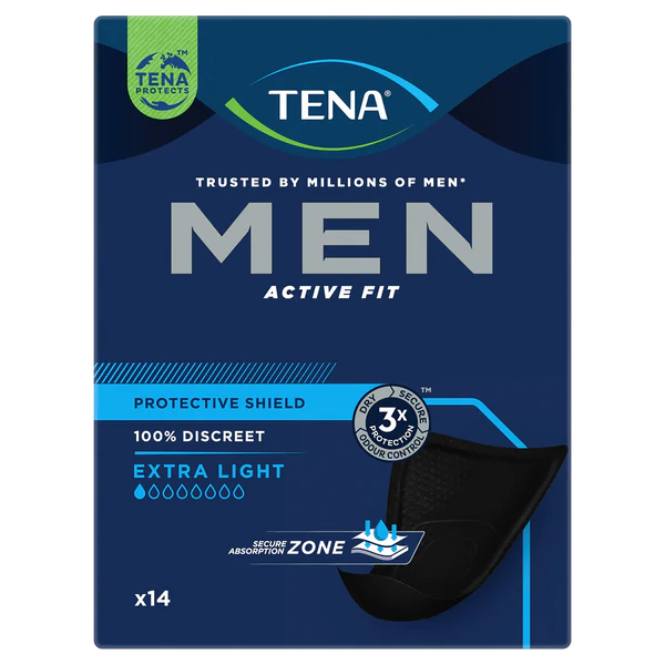 TENA MEN Active Fit Protective Shields are discreetly designed in black with an adhesive strip for secure placement in regular underwear. Each Shield is individually wrapped for your convenience.
