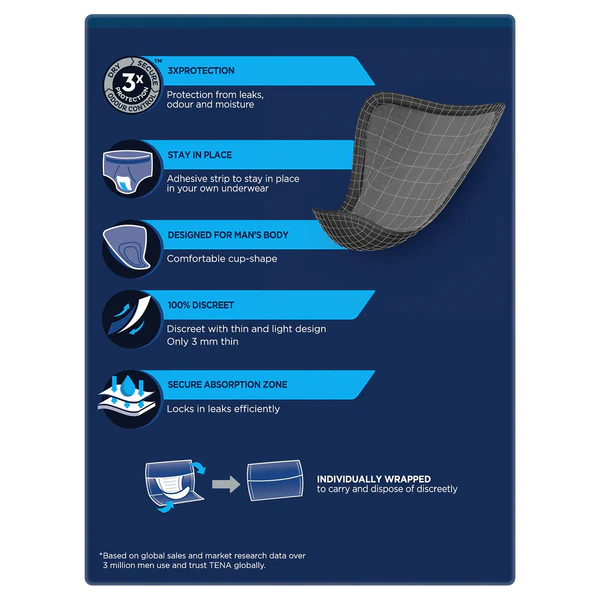 TENA Triple Protection against leaks, odour and moisture, the super absorbent core rapidly absorbs and locks away drips and dribbles. These incontinence shields are ultra-thin at 3mm, made from soft breathable fabric to ensure ultimate comfort and discretion.