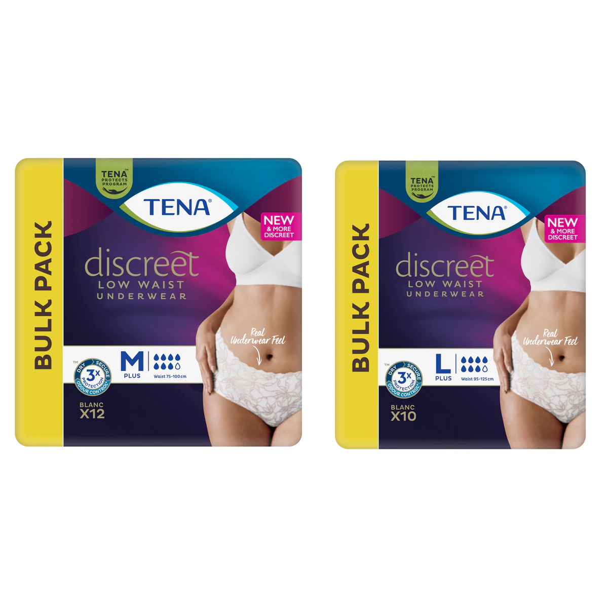 TENA Women’s Discreet Low Waist Blanc incontinence underwear have a stylish low waist design with micro-stretch fabric that make them look and feel just like regular underwear.These disposable incontinence underwear for women are designed to protect against moderate bladder weakness. The reliable absorbent core quickly locks in moderate leaks and protects against odours for incredible discretion.With their elegant, fashionable look, you’ll discover just how beautifully discreet protection against incontinence can be.