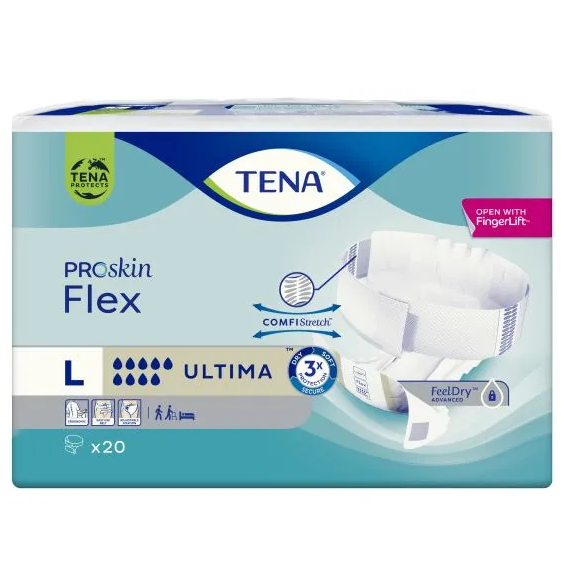 This product also takes care of the skin health by its FeelDry Advanced technology that provides fast absorption, keeping the skin dry, with Triple protection for dryness, softness and leakage security, to help maintain natural skin health. TENA Flex Ultima is ideal for someone less mobile and is suitable for sudden and full emptying of the bladder as well as overnight use.