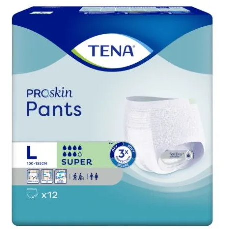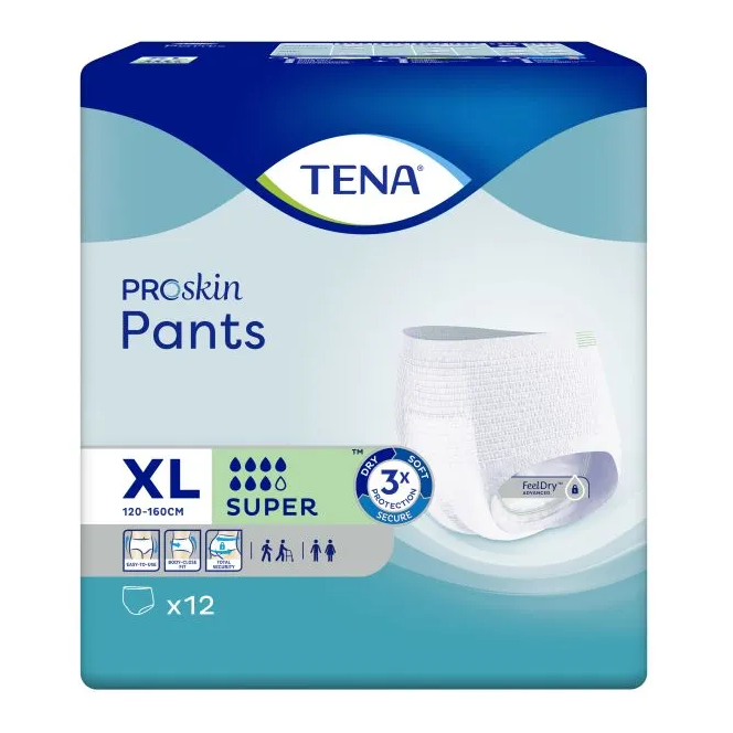 TENA Pants Super are soft and comfortable incontinence pants designed for women and men, great for use during the day. Unlike standard adult diapers, TENA ProSkin Pants have advanced moisture-reducing technologies to ensure dryness, leakage security and odour control.