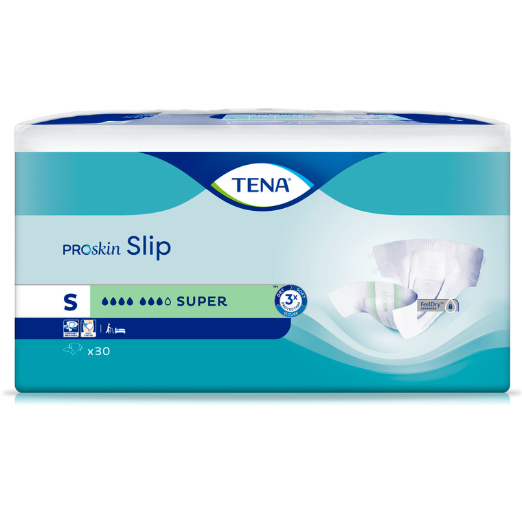 Protection for heavy urine leakage.TENA Slip Super is an open all-in-one incontinence product with adjustable tabs for perfect fit, comfort and leakage protection.TENA ProSkin Slip have soft textile-like material, a body-close fit and a super absorbent core for high leakage security and are ideal for someone semi-mobile or immobile. Thanks to the FeelDry Advanced™ the product quickly draws liquid away from the surface, keeping the skin dry.The fast absorbing core then rapidly locks in urine, even in larger quantities, for dryness and the fully breathable ConfioAir back-sheet allows skin to breathe. All these features help to maintain natural skin health. The open design with strong adhesive tabs enables easy changing when standing or lying down and can be easily re-fastened and adjusted for a perfect, secure fit. For freshness, the product features an Odour Neutralizer and a wetness indicator shows when it’s time to change.