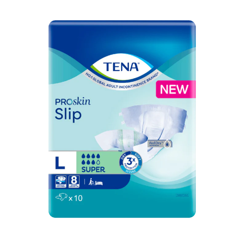 Protection for heavy urine leakage.TENA Slip Super is an open all-in-one incontinence product with adjustable tabs for perfect fit, comfort and leakage protection.TENA ProSkin Slip have soft textile-like material, a body-close fit and a super absorbent core for high leakage security and are ideal for someone semi-mobile or immobile. Thanks to the FeelDry Advanced™ the product quickly draws liquid away from the surface, keeping the skin dry.The fast absorbing core then rapidly locks in urine, even in larger quantities, for dryness and the fully breathable ConfioAir back-sheet allows skin to breathe. All these features help to maintain natural skin health. The open design with strong adhesive tabs enables easy changing when standing or lying down and can be easily re-fastened and adjusted for a perfect, secure fit. For freshness, the product features an Odour Neutralizer and a wetness indicator shows when it’s time to change.