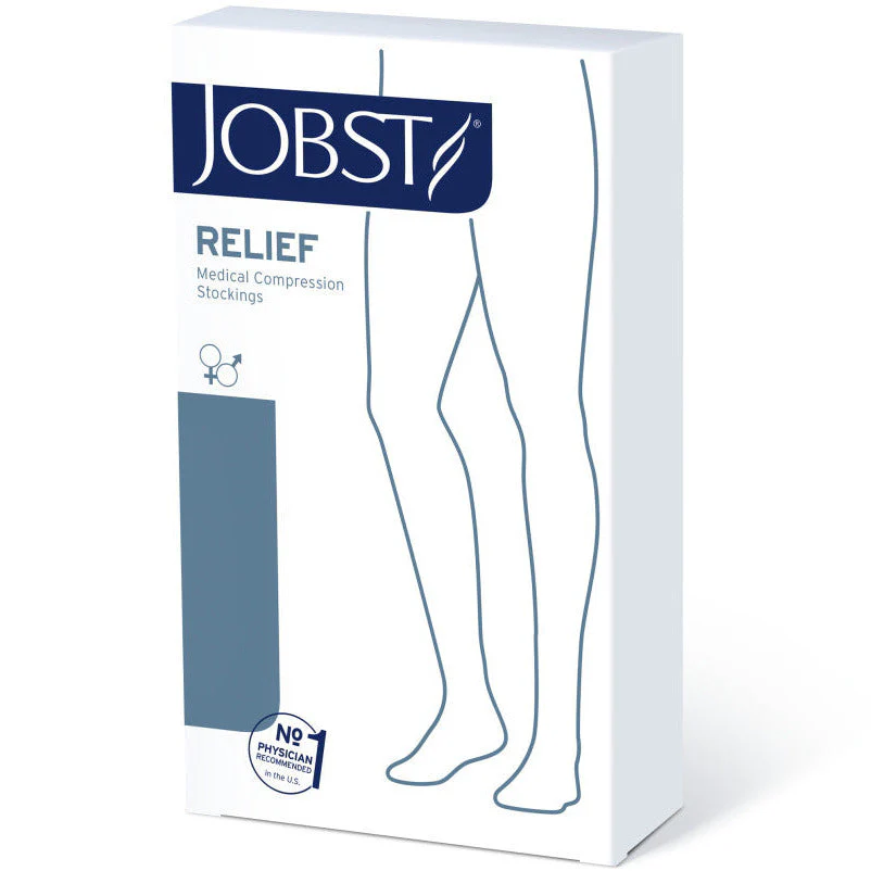 JOBST Relief Thigh High therapeutic stockings that offer durability and comfort in both open and closed toe styles. Comfortable, soft silk texture. Silicone blend softener makes Relief easy to don. Wide comfortable silicone lined support band keeps the garment securely in place. Reinforced heel, hosiery design produces graduated sustained compression.