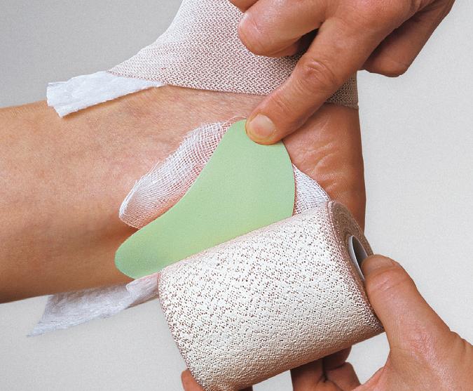 Made of synthetic latex, permeable to air and water vapor, the microporous material with its velvety surface can be easily cut to make the shapes needed for utilization in a multi-layer compression bandage.