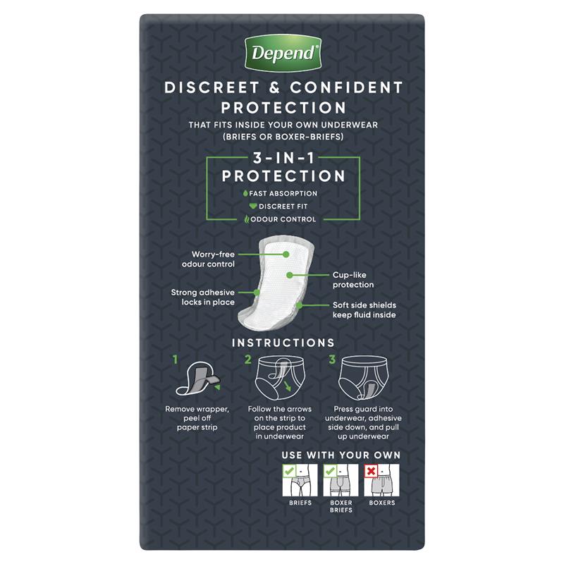Contoured design to fit the male anatomy,Extra absorbent layer in center offers added protection to absorb fluid quickly and reduce odour,Soft side shields keep fluid inside, away from clothing, to prevent leakage,Two adhesive strips hold the guard securely in place,Individually wrapped for convenience and disposability,