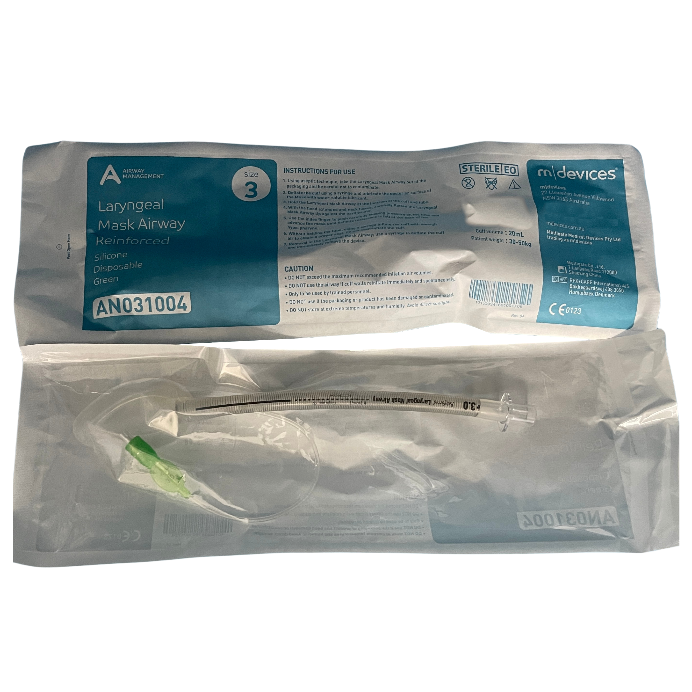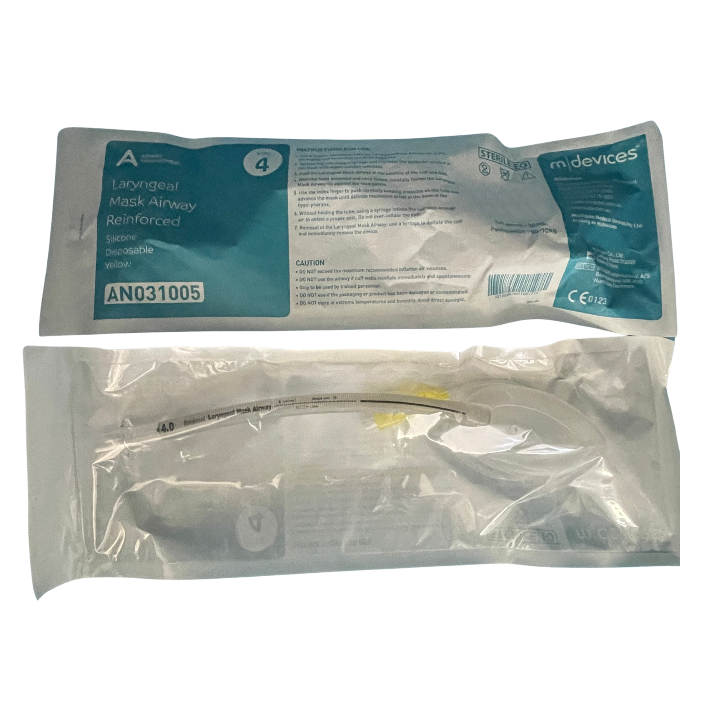 m|devices reinforced silicone disposable Laryngeal Masks Airways have a smooth one-piece design with guide markings to enable an easy insertion and provide depth of positioning. The reinforced tubing reduces kinking and provides support during difficult intubations. The translucent tubing allows clear visibility and the soft seal cuff which is permeable to nitrous oxide, reduces pressure rises and minimises potential trauma.