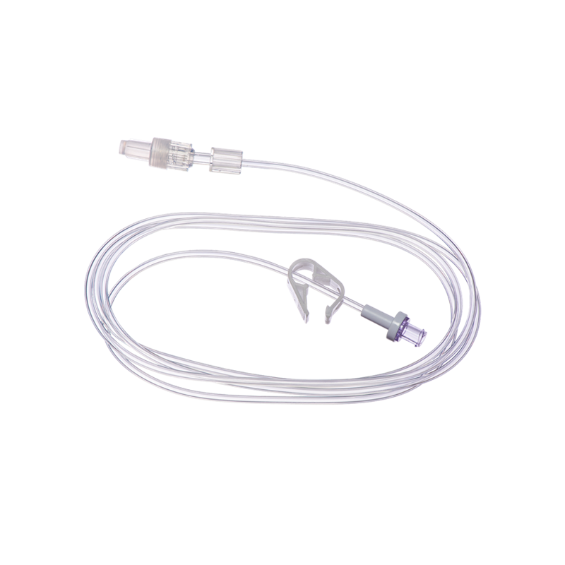 Mdevices IV Minimum Volume Extension Set with standard injection site is 165cm in length. This set has a click clamp and a female luer lock to male luer lock with rotating collar. The set should always be primed prior to connecting to a peripheral catheter or access device on an IV administration set. For more information, click PDS and IFU.