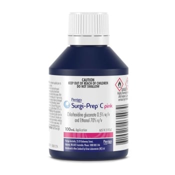 Shop Surgi-Prep C Pink 100ml, a potent solution of Chlorhexidine 0.5% and Ethanol 70%. Ideal for pre-surgical skin preparation. Safe and effective.