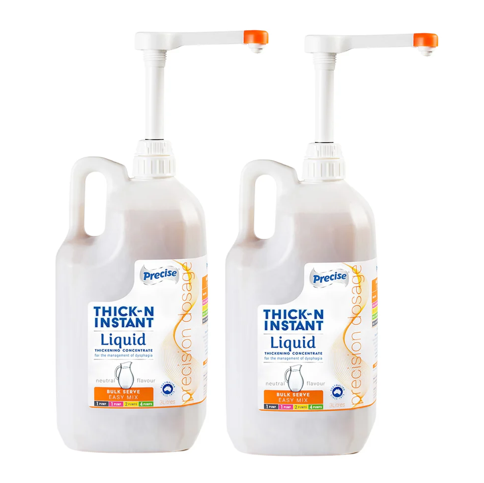 Precise Thick-N INSTANT Bulk Serve is designed for preparing larger quantities of thickened fluids, making it ideal for drinks prepared in advance in commercial kitchens and healthcare facilities. It is identified by its orange colour-coded pump and label.