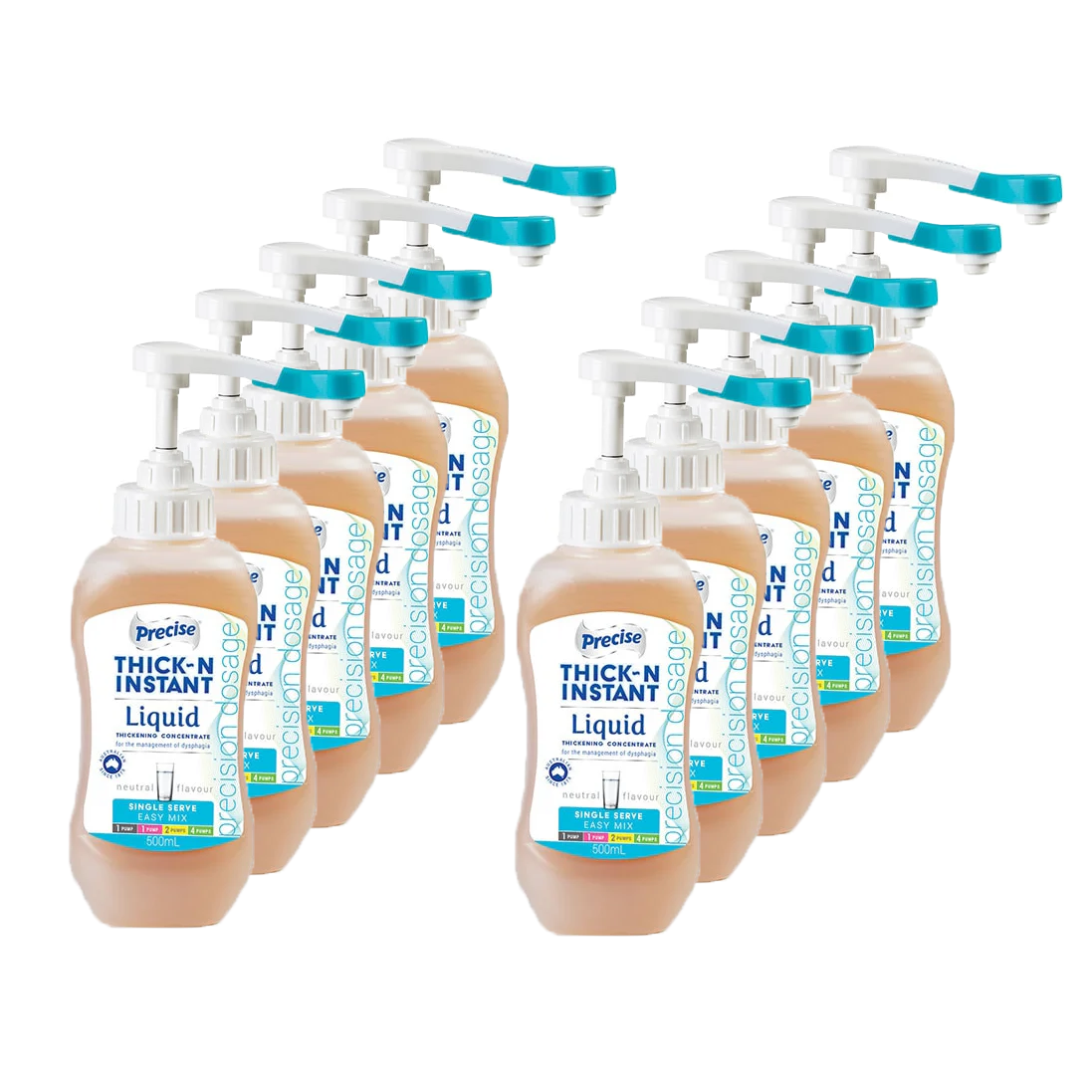 Precise Thick-N INSTANT Single Serve bottles are designed for preparing individual serves of thickened fluids. Ideal for drink and medication trolleys or home use, they are identified by their aqua colour-coded pump and label.