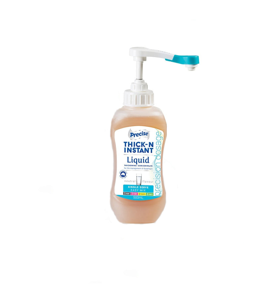 Precise Thick-N INSTANT Single Serve bottles are designed for preparing individual serves of thickened fluids. Ideal for drink and medication trolleys or home use, they are identified by their aqua colour-coded pump and label.