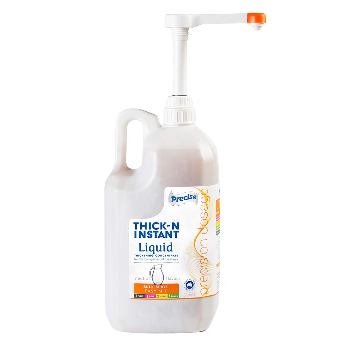 Precise Thick-N INSTANT Bulk Serve is designed for preparing larger quantities of thickened fluids, making it ideal for drinks prepared in advance in commercial kitchens and healthcare facilities. It is identified by its orange colour-coded pump and label.