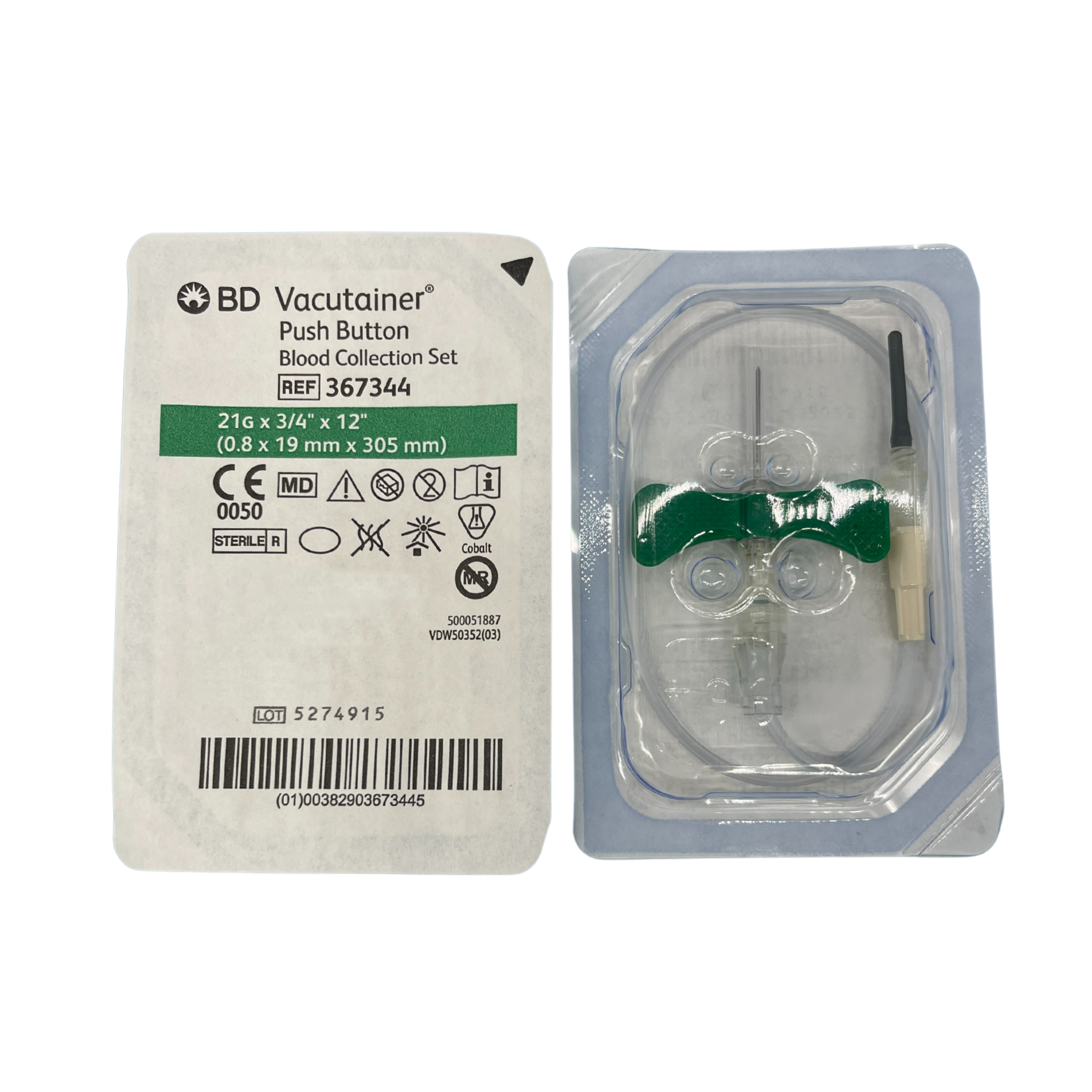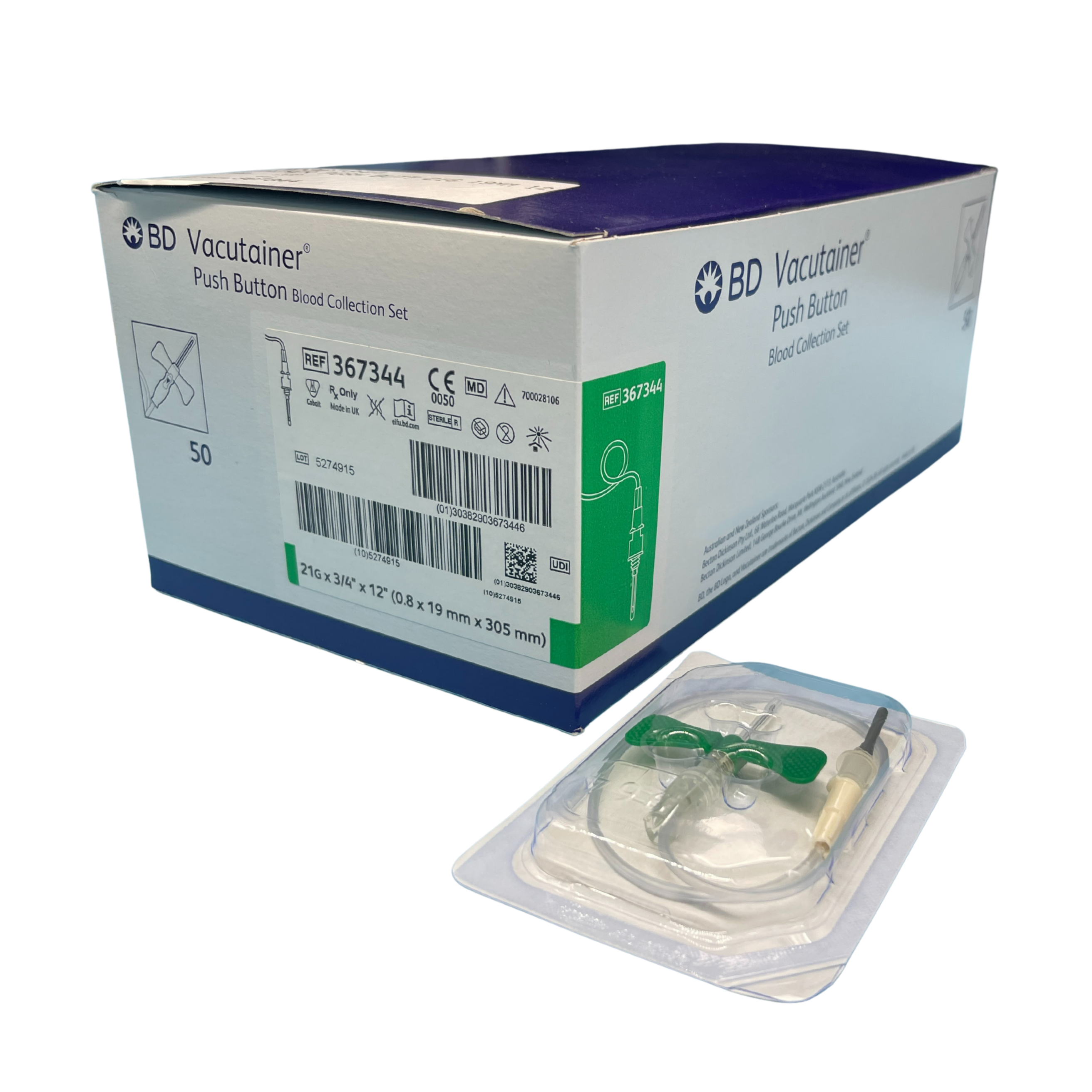 BD Vacutainer Push Button Blood Collection Set, with Luer Adapter, 21Gx 0.75" Needle, 12" Tubing, Green (367344) Box of 50BD_367344_50_WH