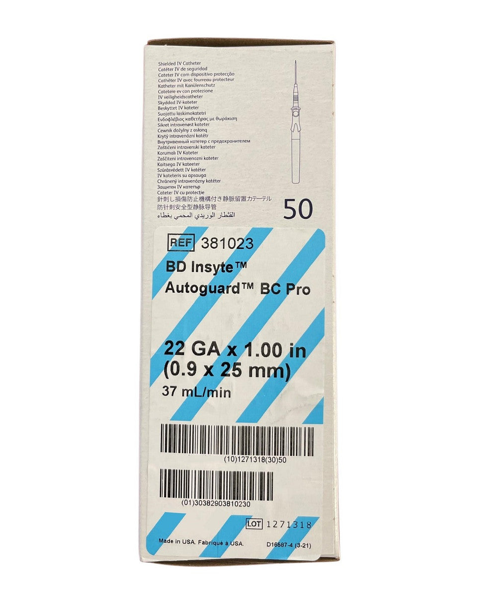 | 381023 | BD Insyte IV Catheter | 22G (Blue) | 1 Inch (25mm) | Autoguard BC (Blood Control) Non Winged |