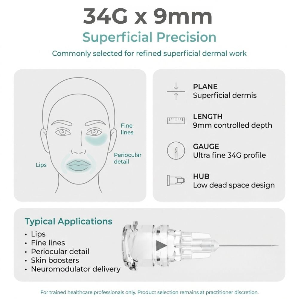 | 34G x 9mm | Lips, fine lines, superficial precision work | Superficial dermis |