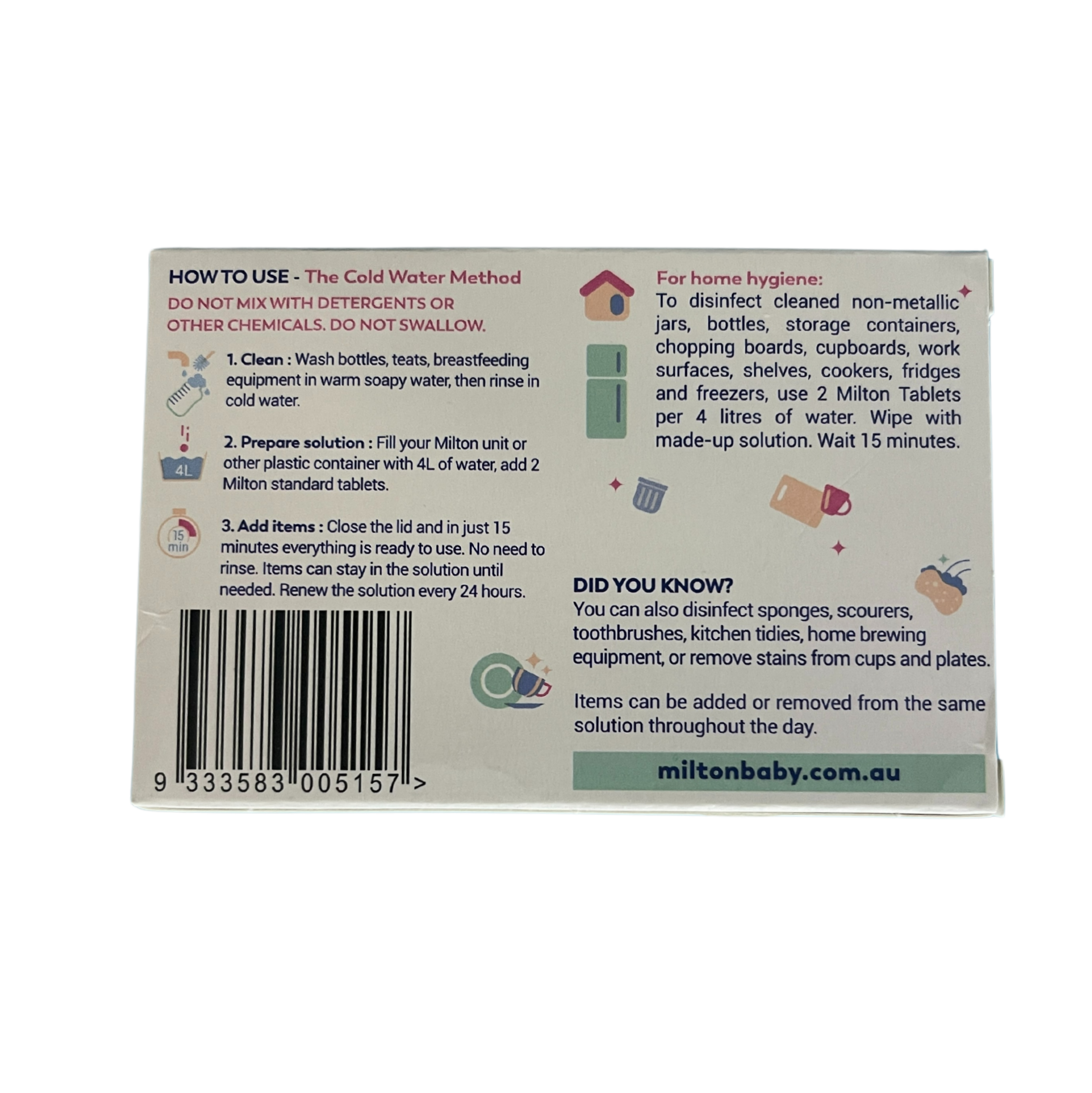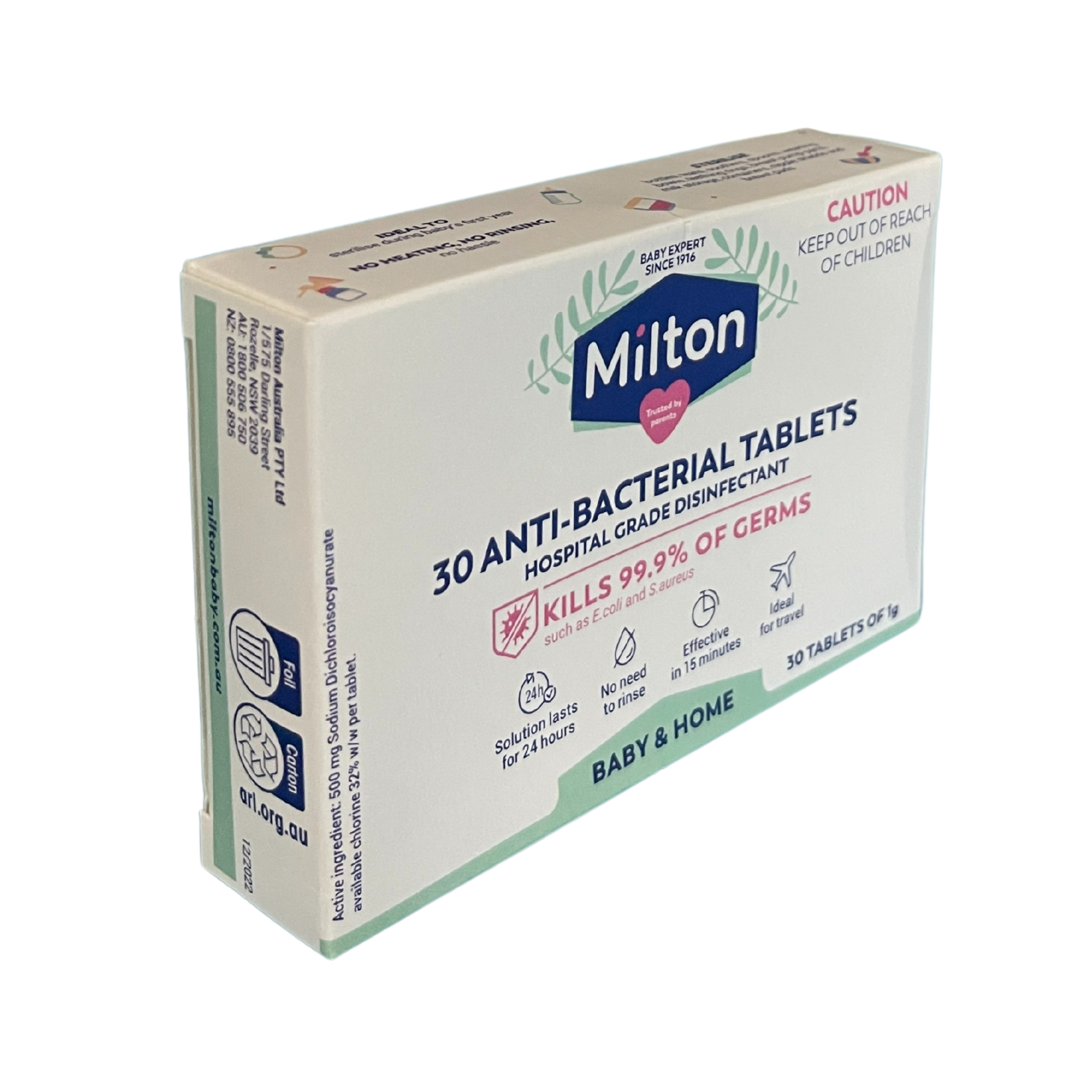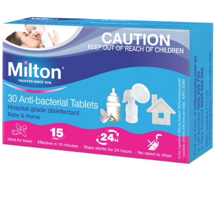 Milton Sterilising Tablets allow you to sterilise in just 15 minutes, killing bacteria, viruses, fungi and spores (tough dormant bacteria). Milton Sterilising Tablets have been used in hospitals for many years and are a simple and very reliable method. Milton Antibacterial Tablets effectively disinfects and sanitises breast expression equipment, bottles, teats, feeding untensils, dummies, toys, surfaces and many other plastic household items.