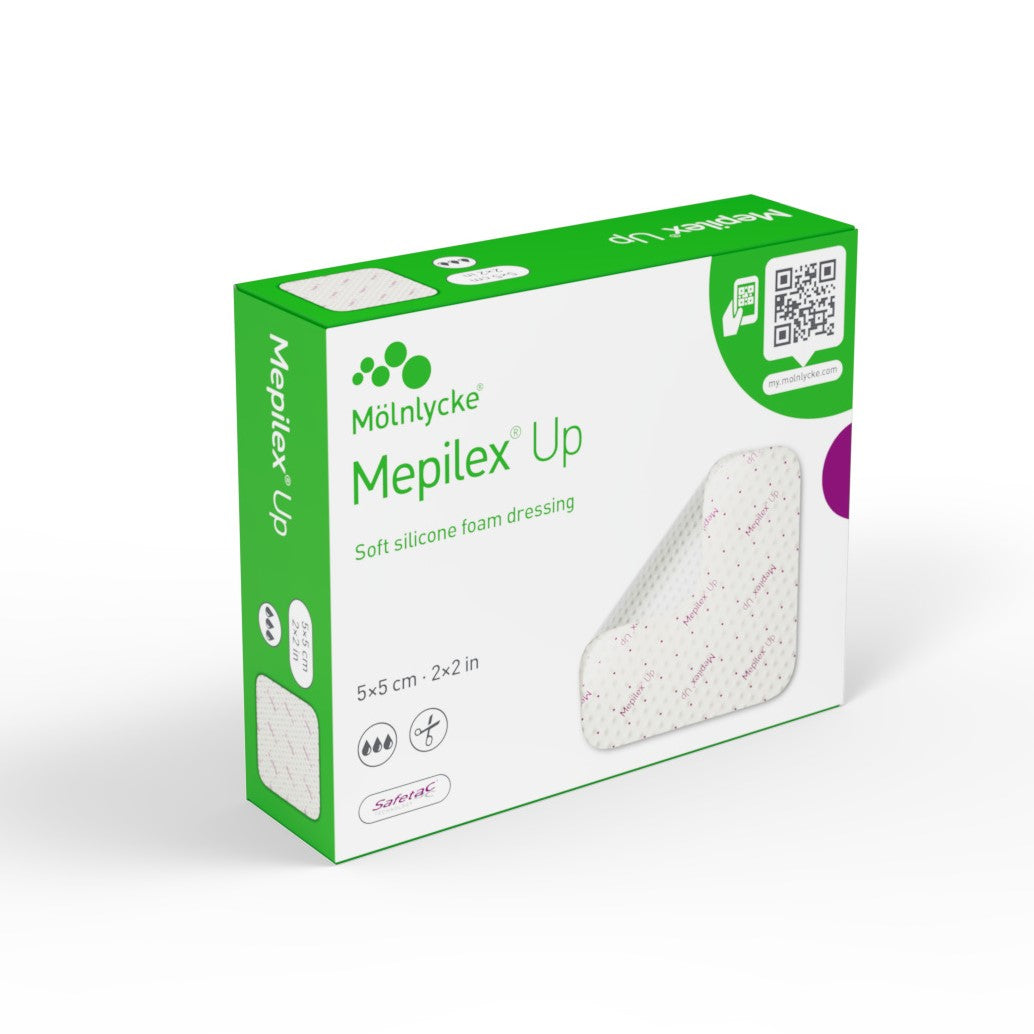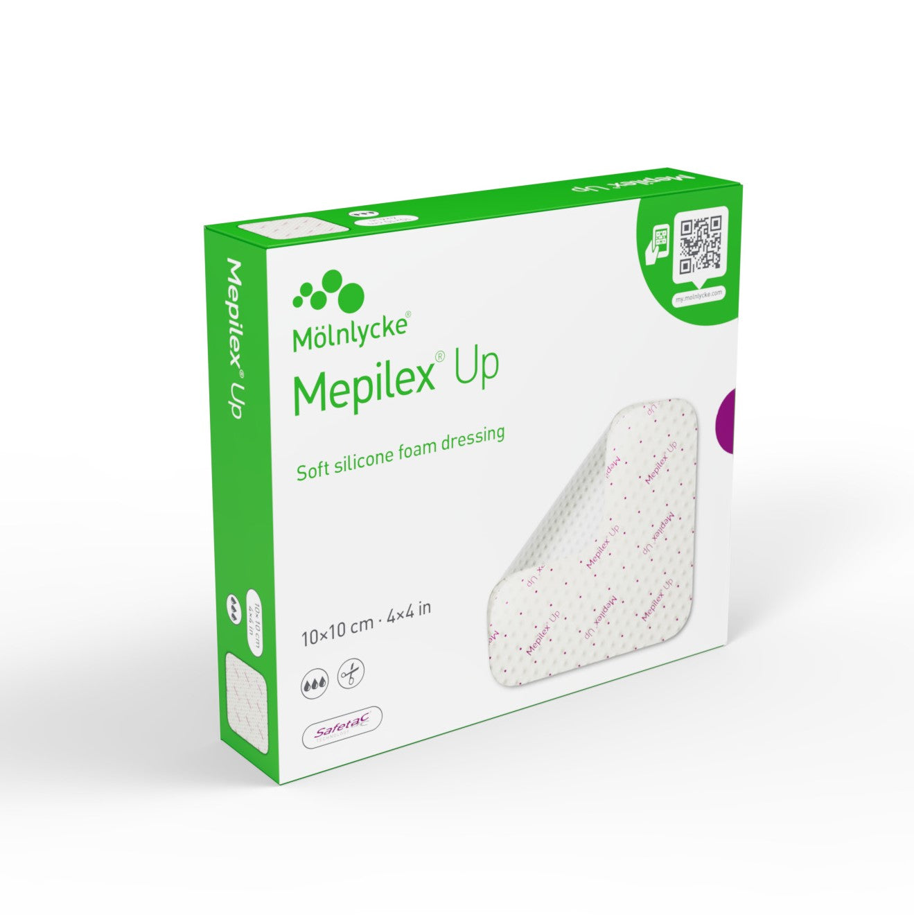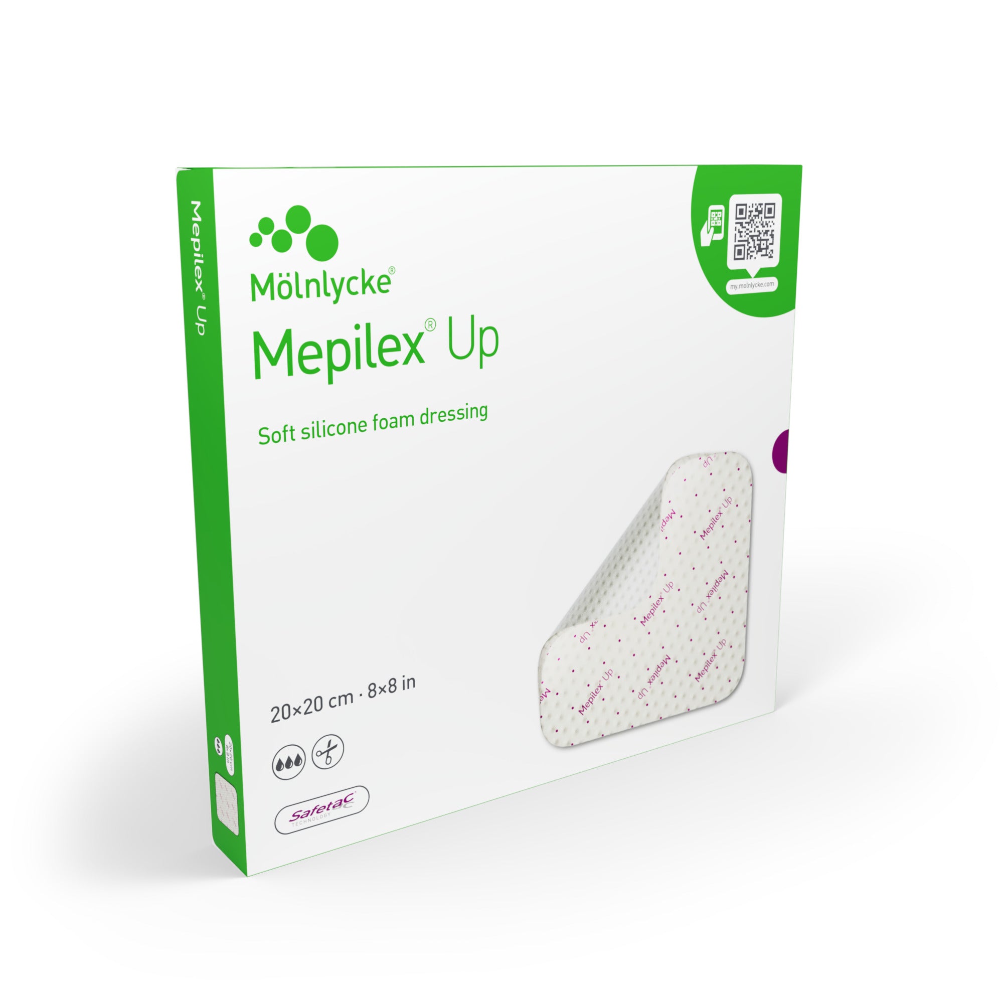 Mepilex Up is a highly conformable dressing that absorbs both low and high viscous exudates, maintains a moist wound environment and minimises the risk of maceration. The soft silicone layer (Safetac®) is non-adherent to the moist wound site, but adheres gently to the dry peri-wound skin. It protects the wound and skin as well as minimises pain to patients and trauma to wounds and the surrounding skin at dressing removal.
