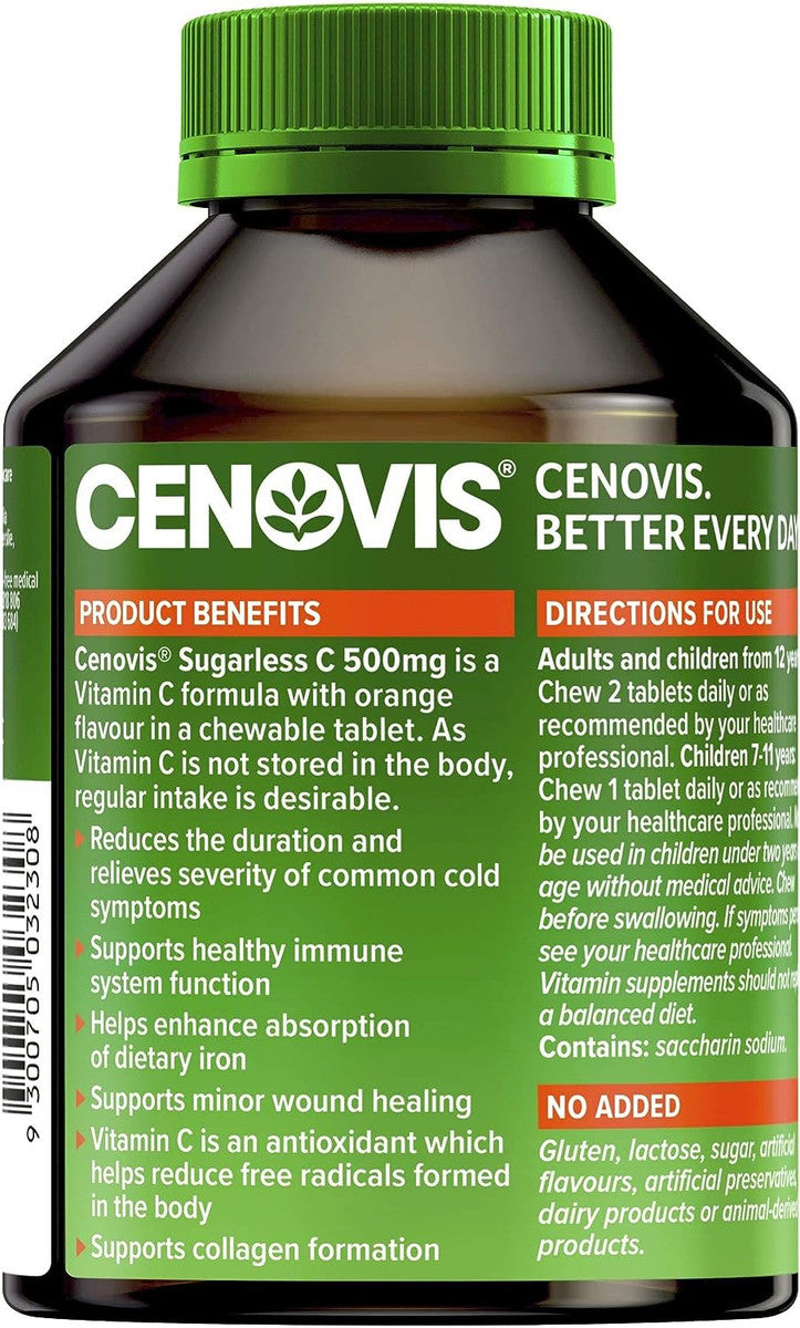 Cenovis® Sugarless C may assist in the management of colds by reducing the severity and duration of symptoms. Vitamin C may also support the function of the immune system. Vitamin C helps maintain healthy gums and may assist in wound healing and tissue repair. It is an antioxidant which can act as a free radical scavenger. As Vitamin C is not stored in the body, regular intake is desirable.