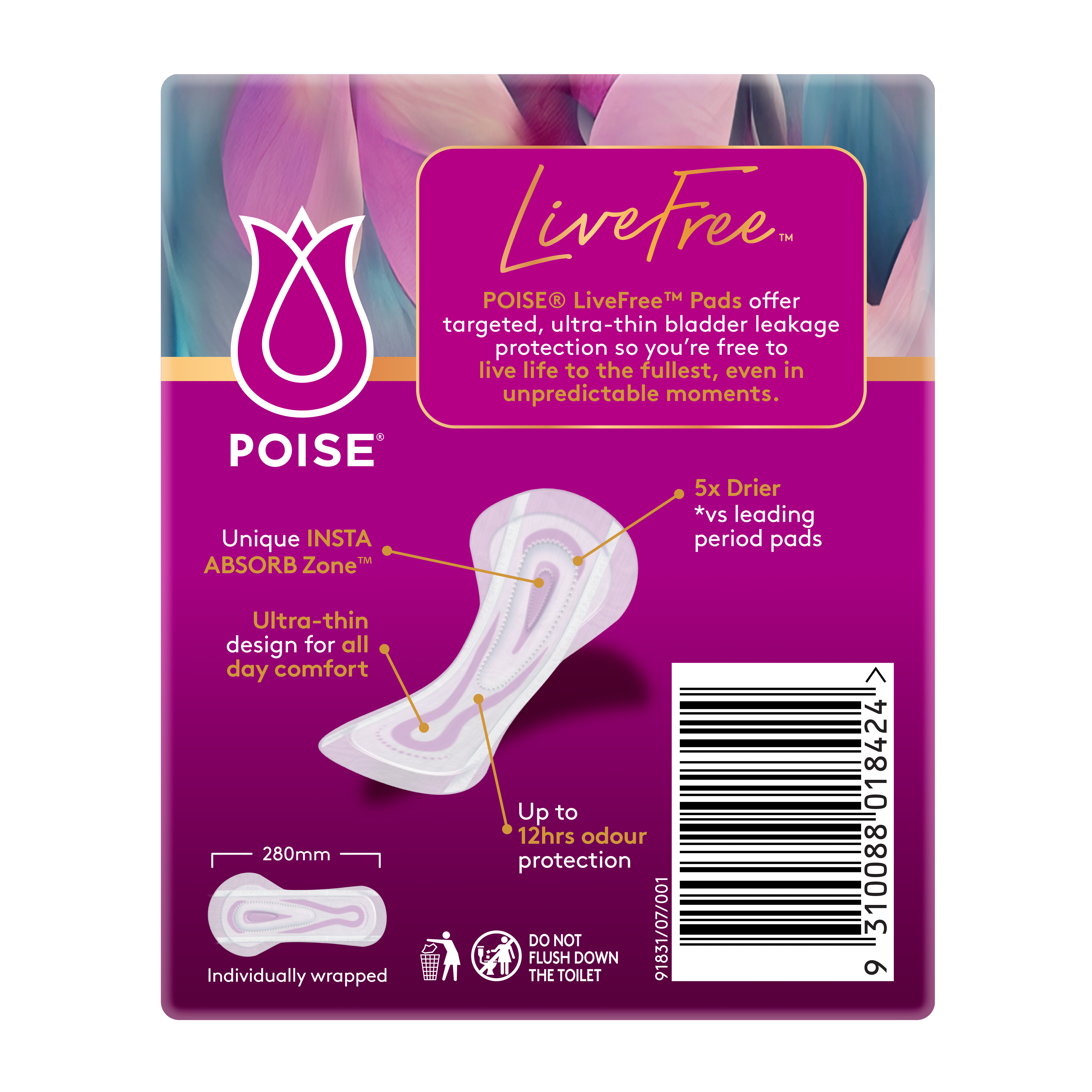Experience the freedom to live life to the fullest with Poise LiveFree Pads. These pads offer targeted, ultra-thin bladder leakage protection, ensuring you stay confident and comfortable, even in unpredictable moments.