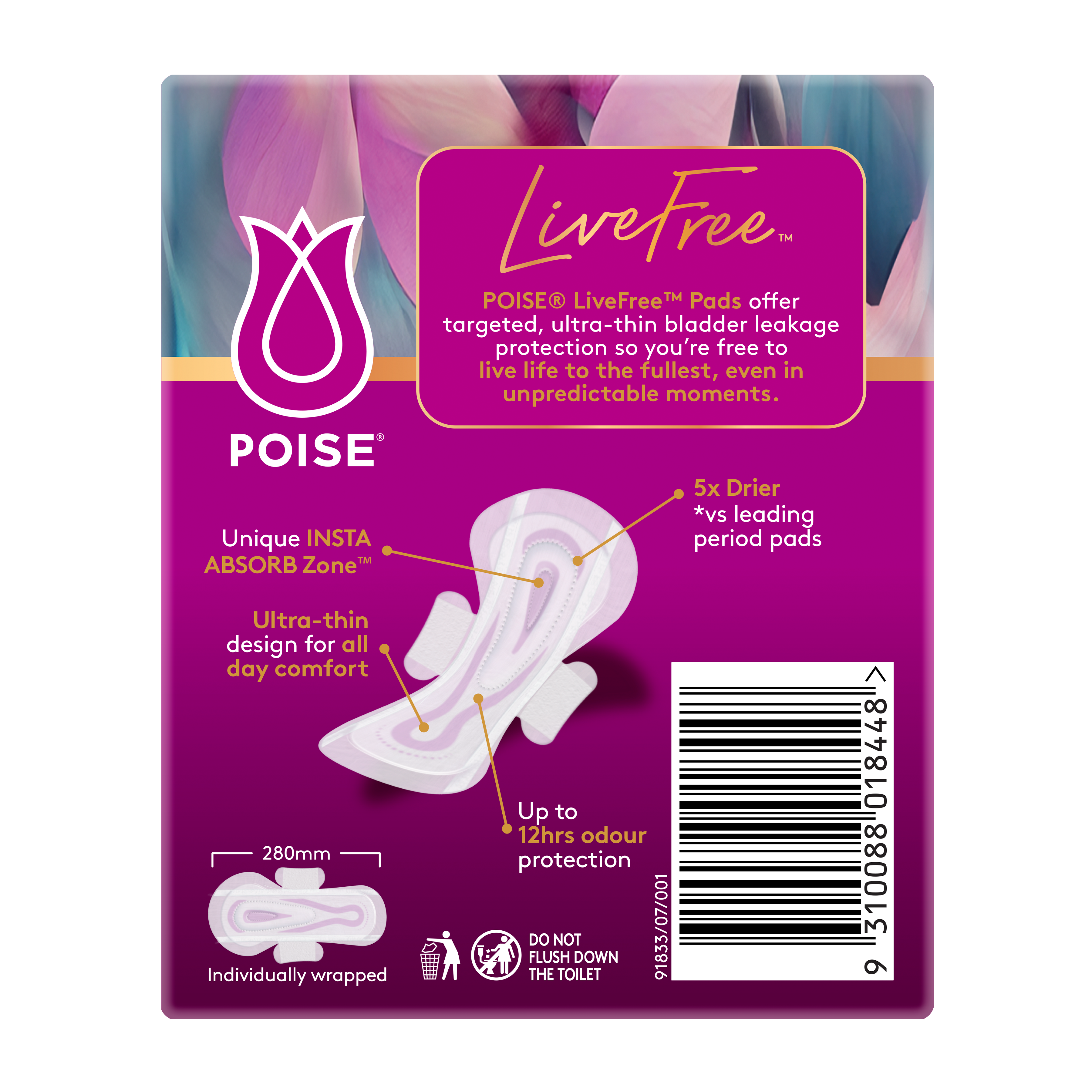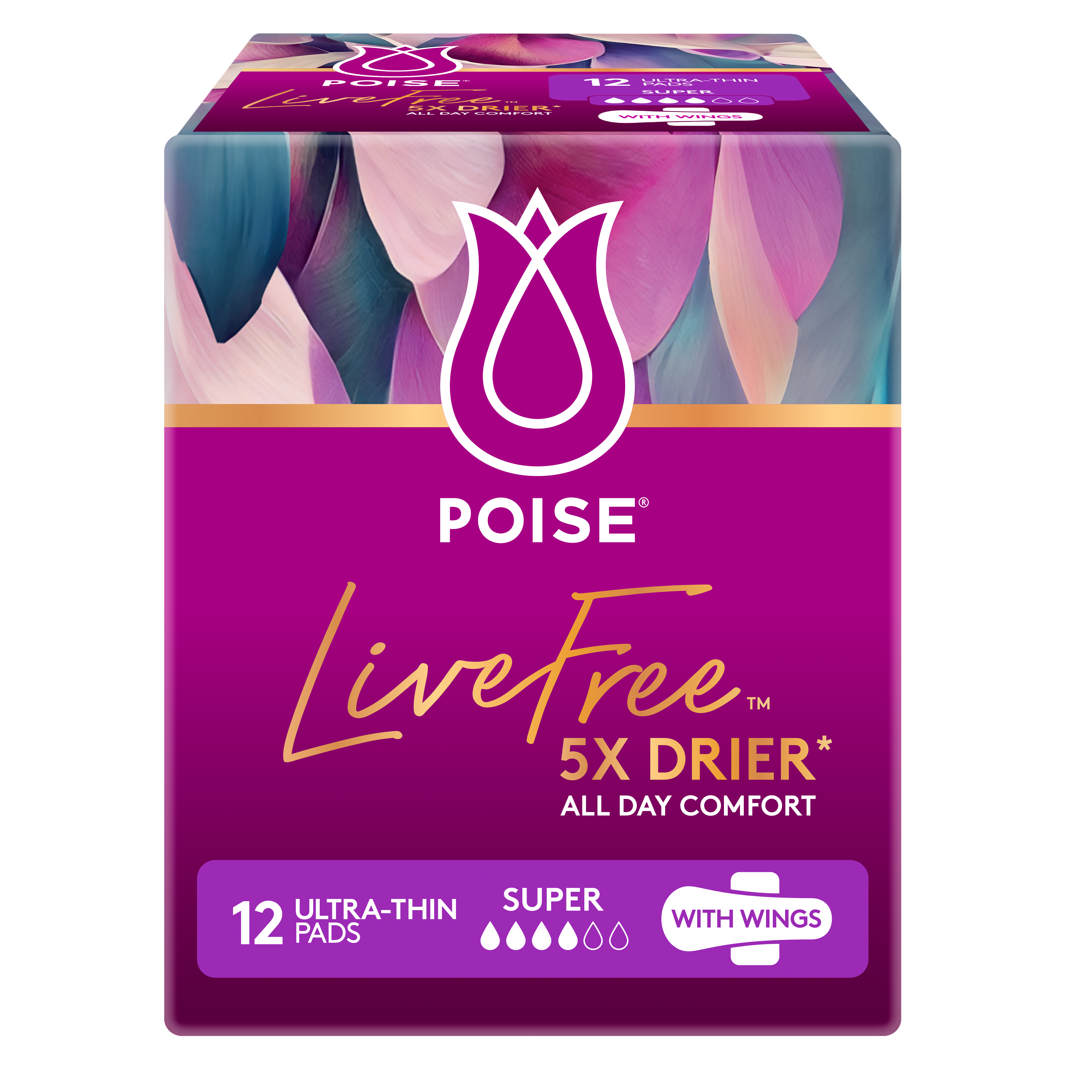 - Poise LiveFree Pads are 5 times drier than leading period pads, offering superior dryness and comfort.