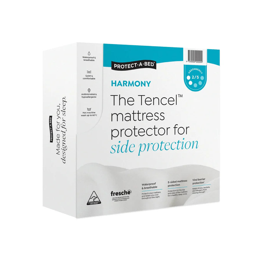 The Protect-A-Bed Harmony Tencel Mattress Protector offers 5-sided protection for your mattress, featuring a soft, waterproof, and breathable Tencel™ sleep surface that extends to the sides and is safe for both adults and children. Made from sustainably sourced wood-based fibres, it provides superior moisture-wicking and is hypoallergenic, acting as a barrier against dust mites, mould, and other allergens while protecting against spills and stains.