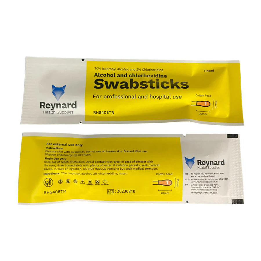 A wetted cotton head adhered to a 10cm plastic stick which can be used to sanitise the skin. Each swabstick is impregnated with 2% chlorhexidine digluconate & 70% isopropyl alcohol.