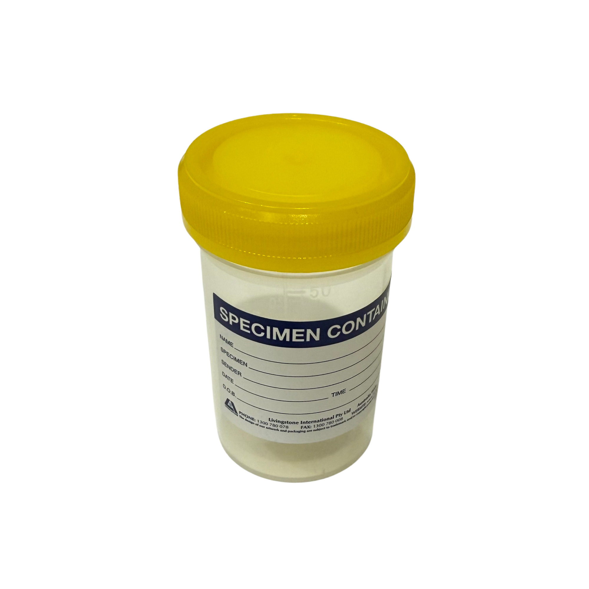 The Livingstone specimen sample container TP5744SLN is a sterile, 70ml, polypropylene (PP) specimen container with a yellow screw cap, designed for collecting and storing biological samples, including urine, sputum, and tissue, and suitable for water sampling as well. It is individually wrapped and sterile, with a labelled surface for clear identification.